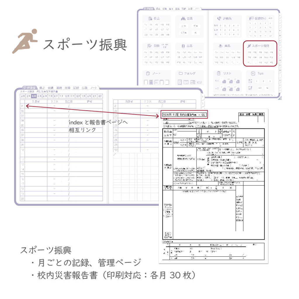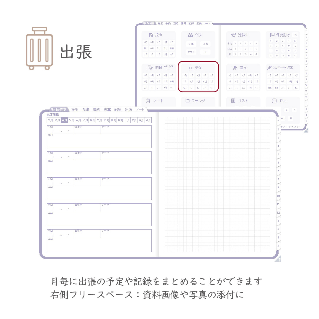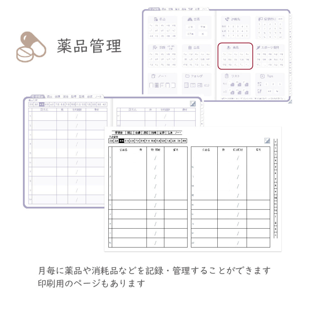保健室業務をひとつにまとめて、記録と管理をスムーズにする養護教諭専用のデジタル手帳です。