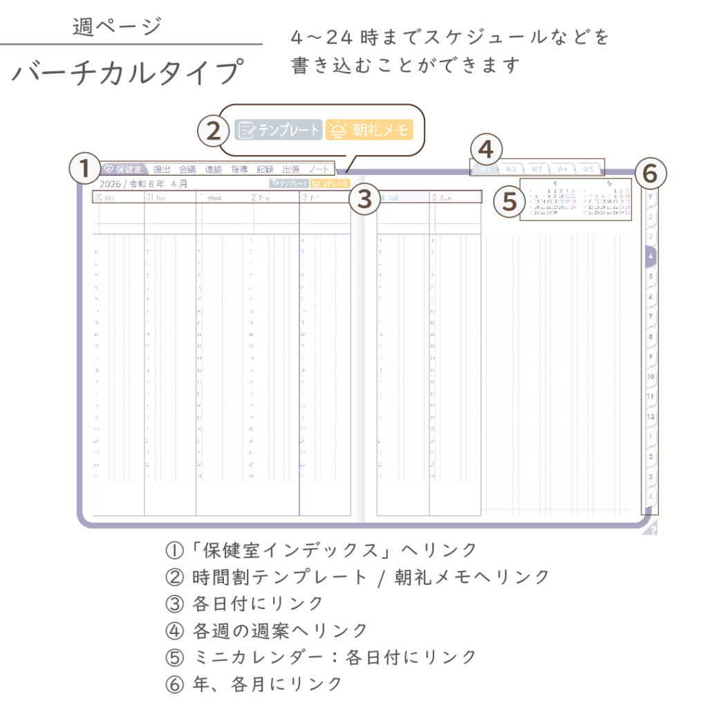 2026年度「ほけんしつ手帳」【週:バーチカル】【色:スミレ】