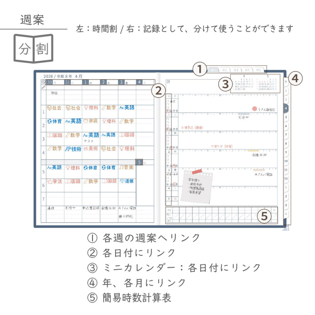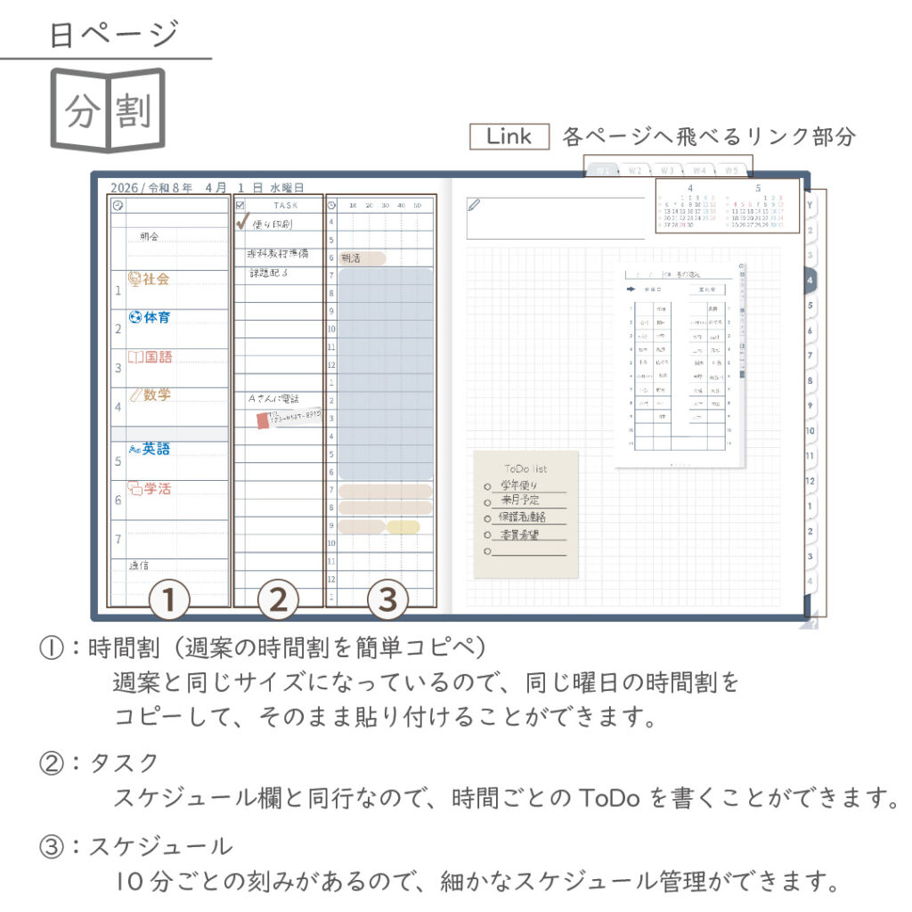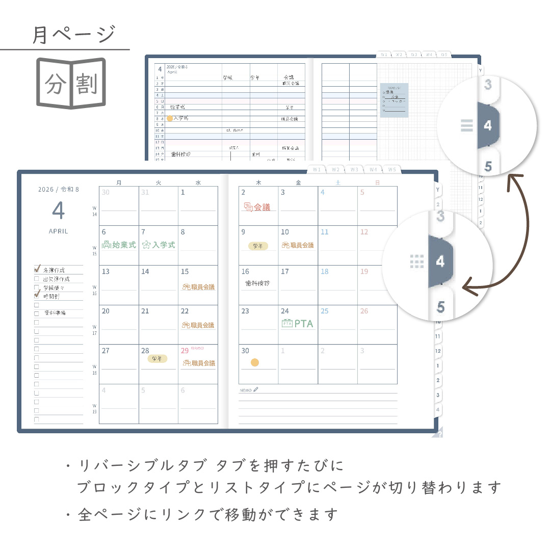 2026年度「先生手帳(中高版)」【ライト:分割】【色:ネイビー】