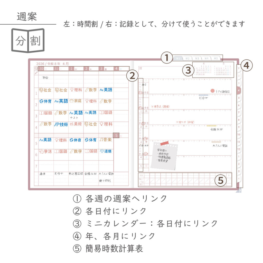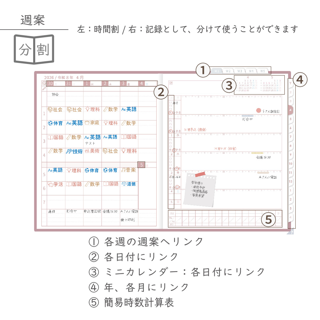 2026年度「先生手帳(中高版)」【ライト:分割】【色:サクラ】