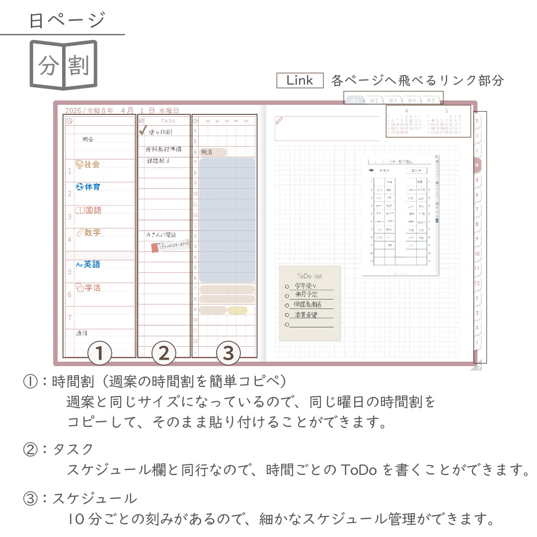 週案を軸に、年間・月間・週・日を管理できる