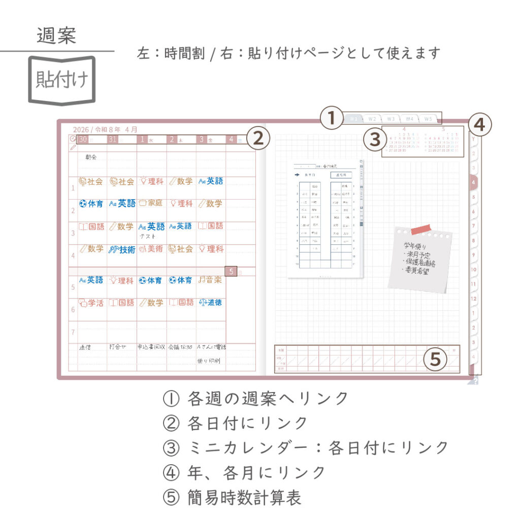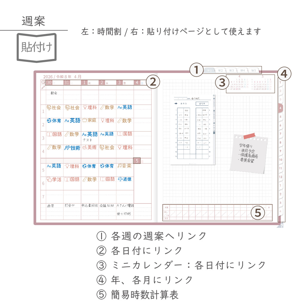 週案を軸に、年間・月間・週・日を管理できる