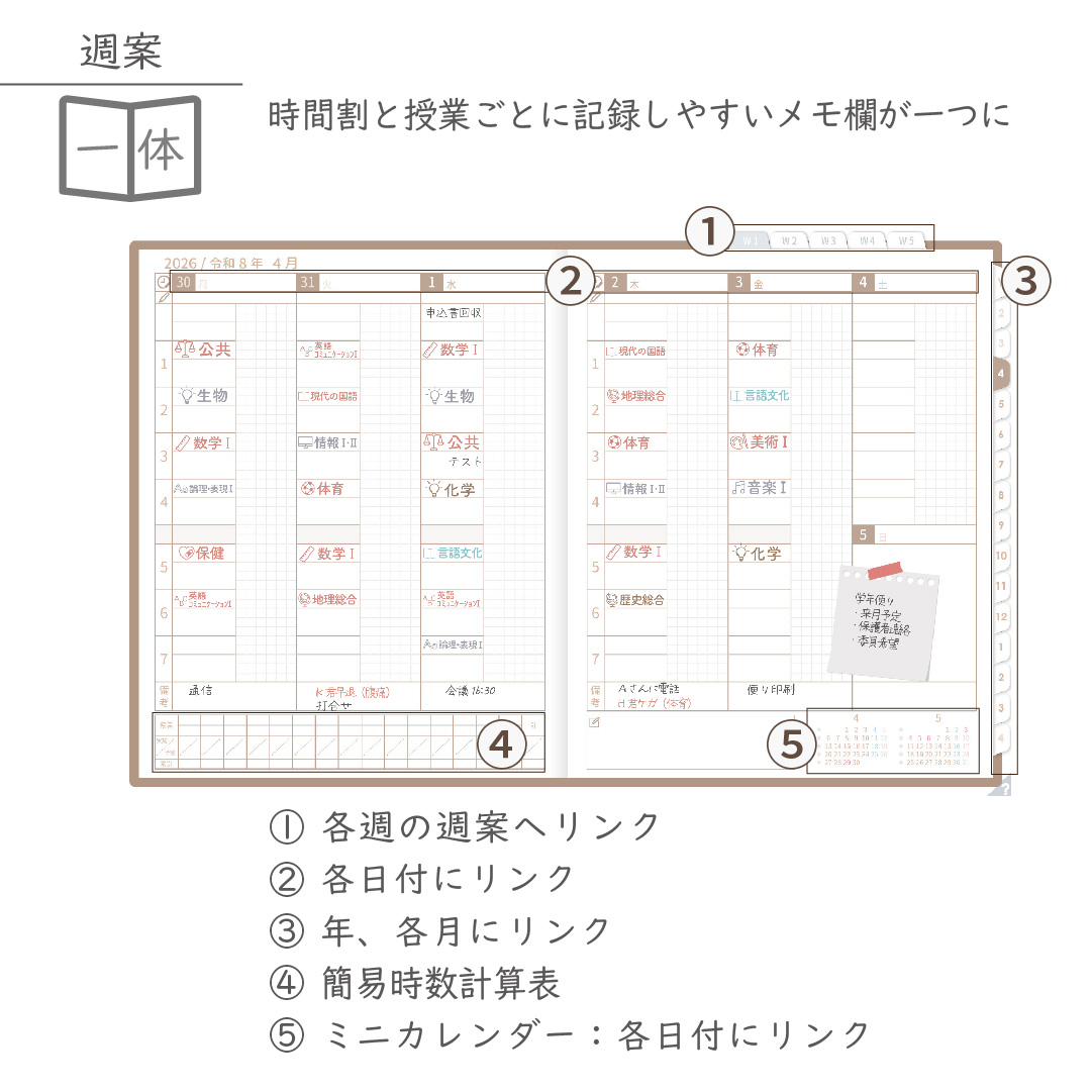 週案を軸に、年間・月間・週・日を管理できる