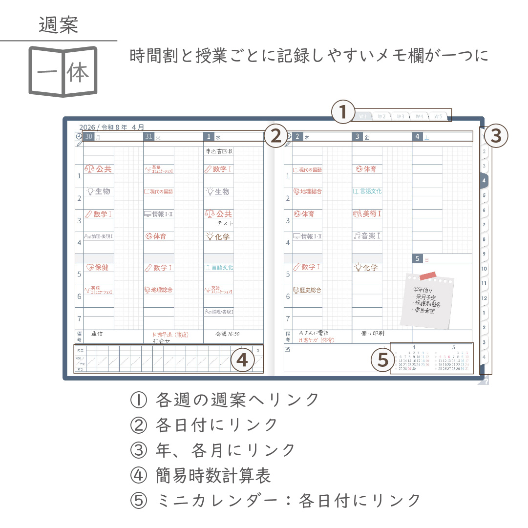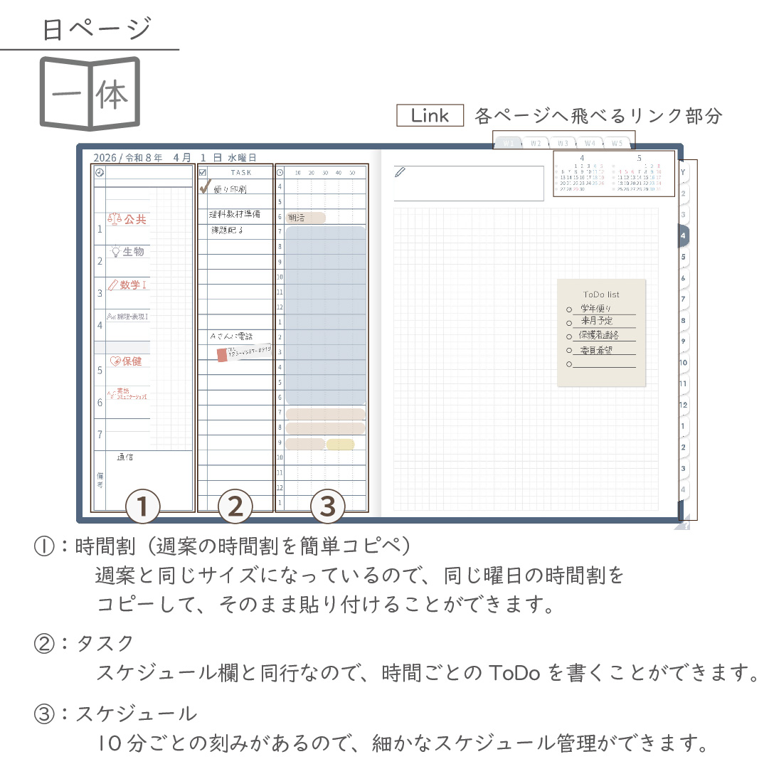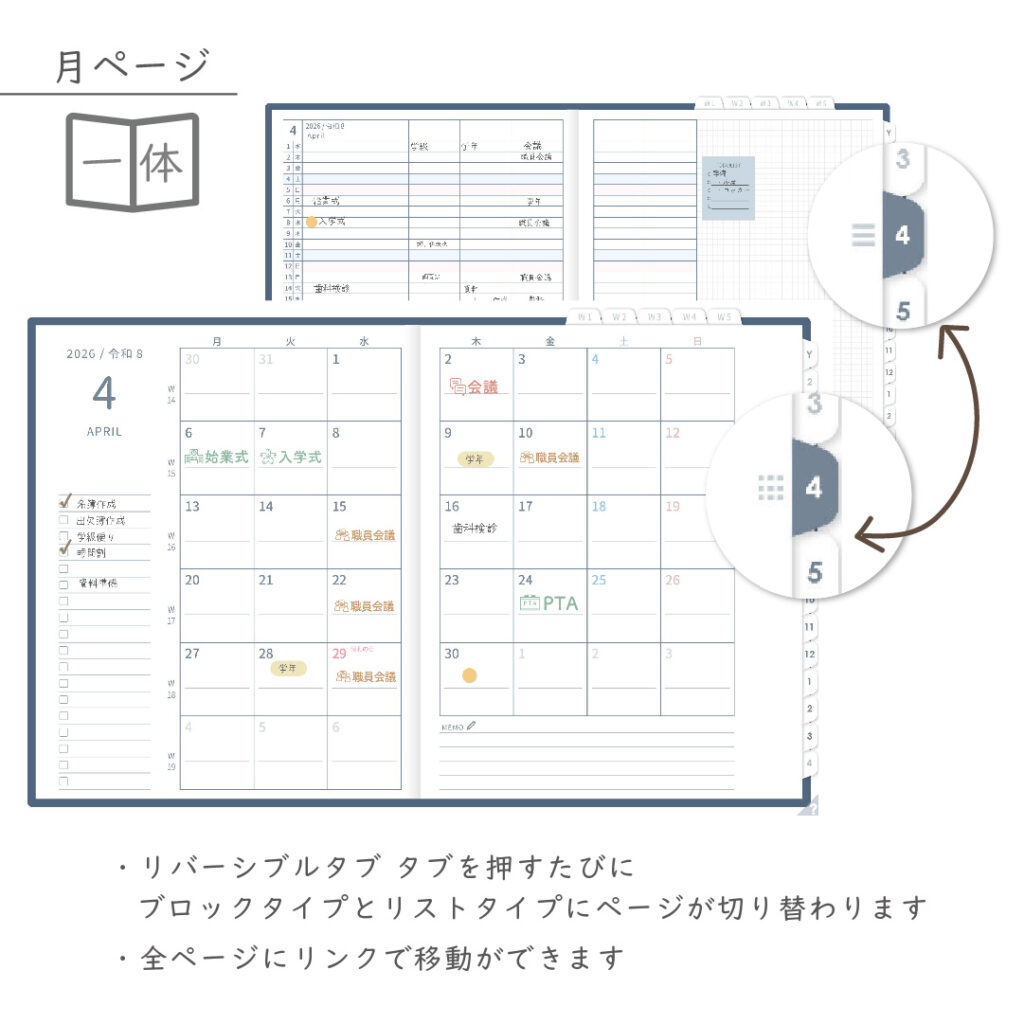 2026年度「先生手帳(中高版)」【ライト:一体】【色:ネイビー】