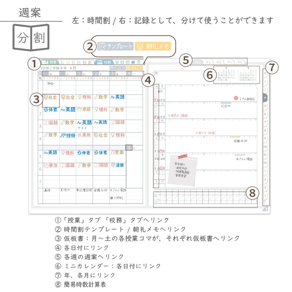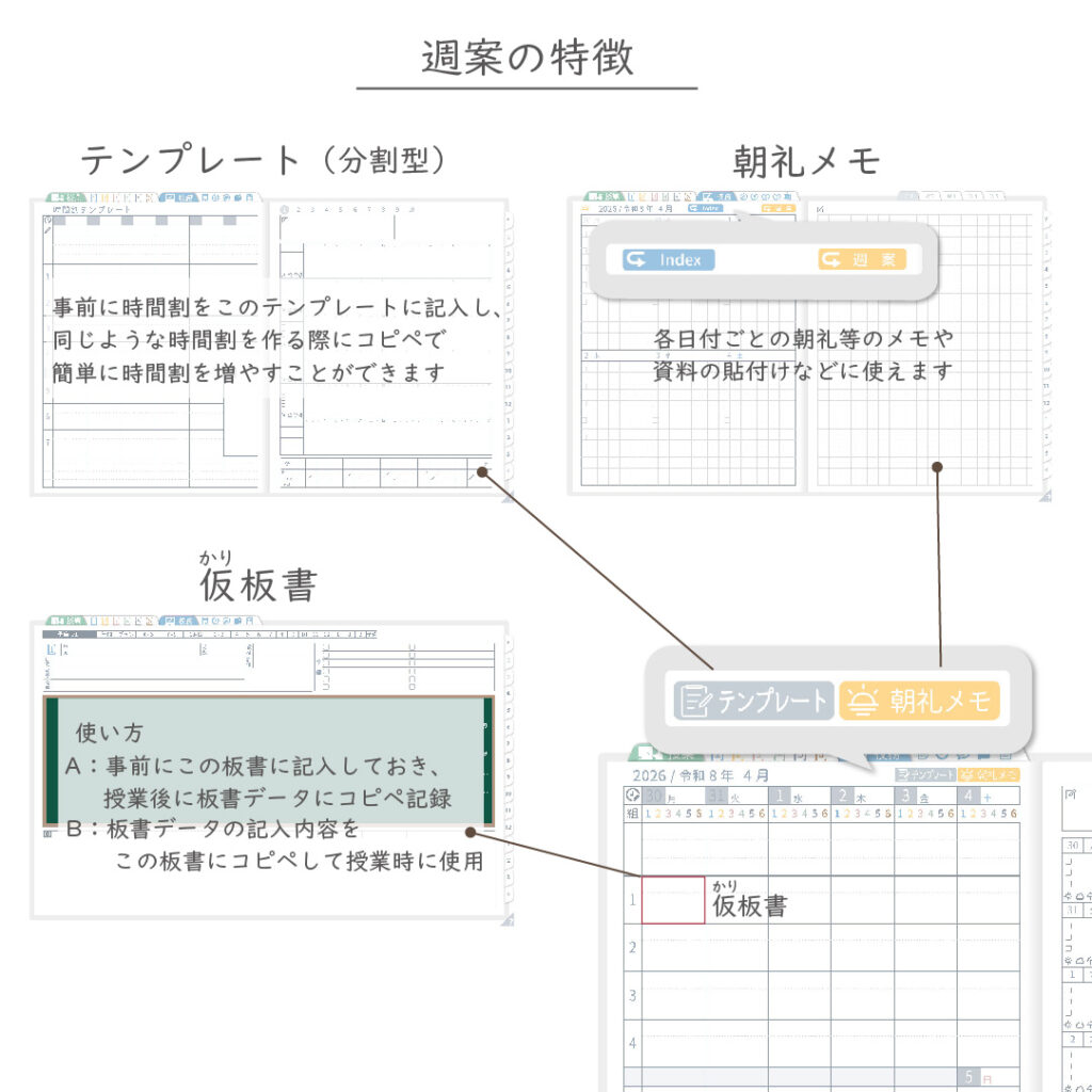 ・週案(※2)は3タイプから選べ、板書ページがリンクで直ぐに開けます