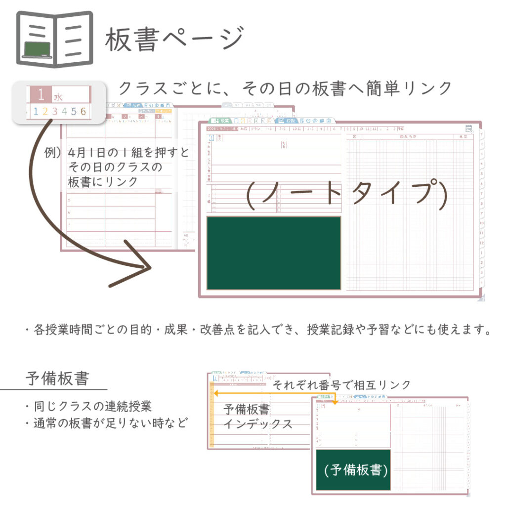 ・週案(※2)は3タイプから選べ、板書ページがリンクで直ぐに開けます