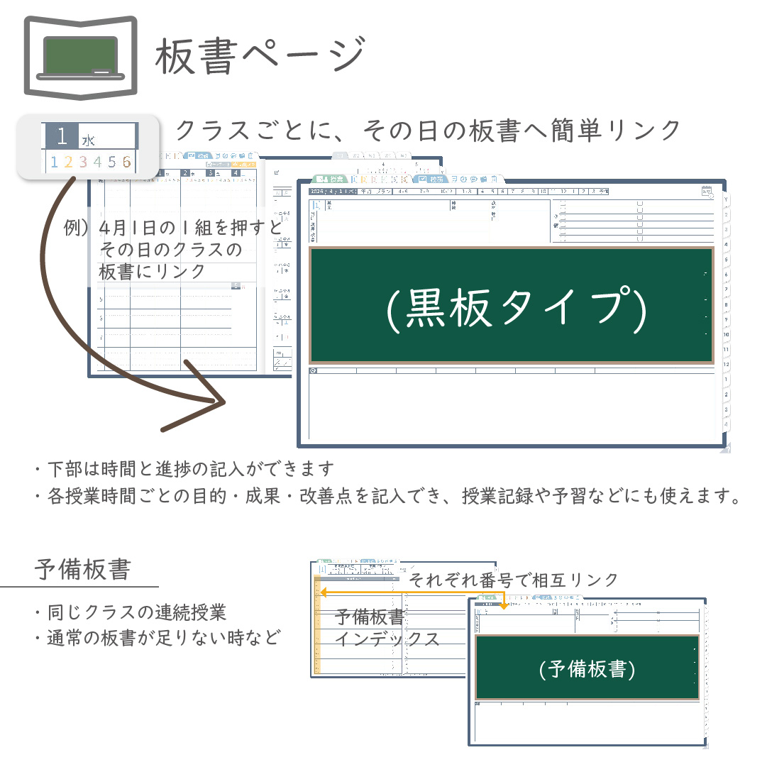・週案(※2)は3タイプから選べ、板書ページがリンクで直ぐに開けます