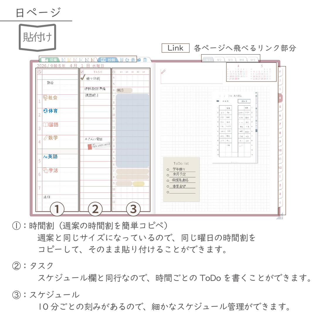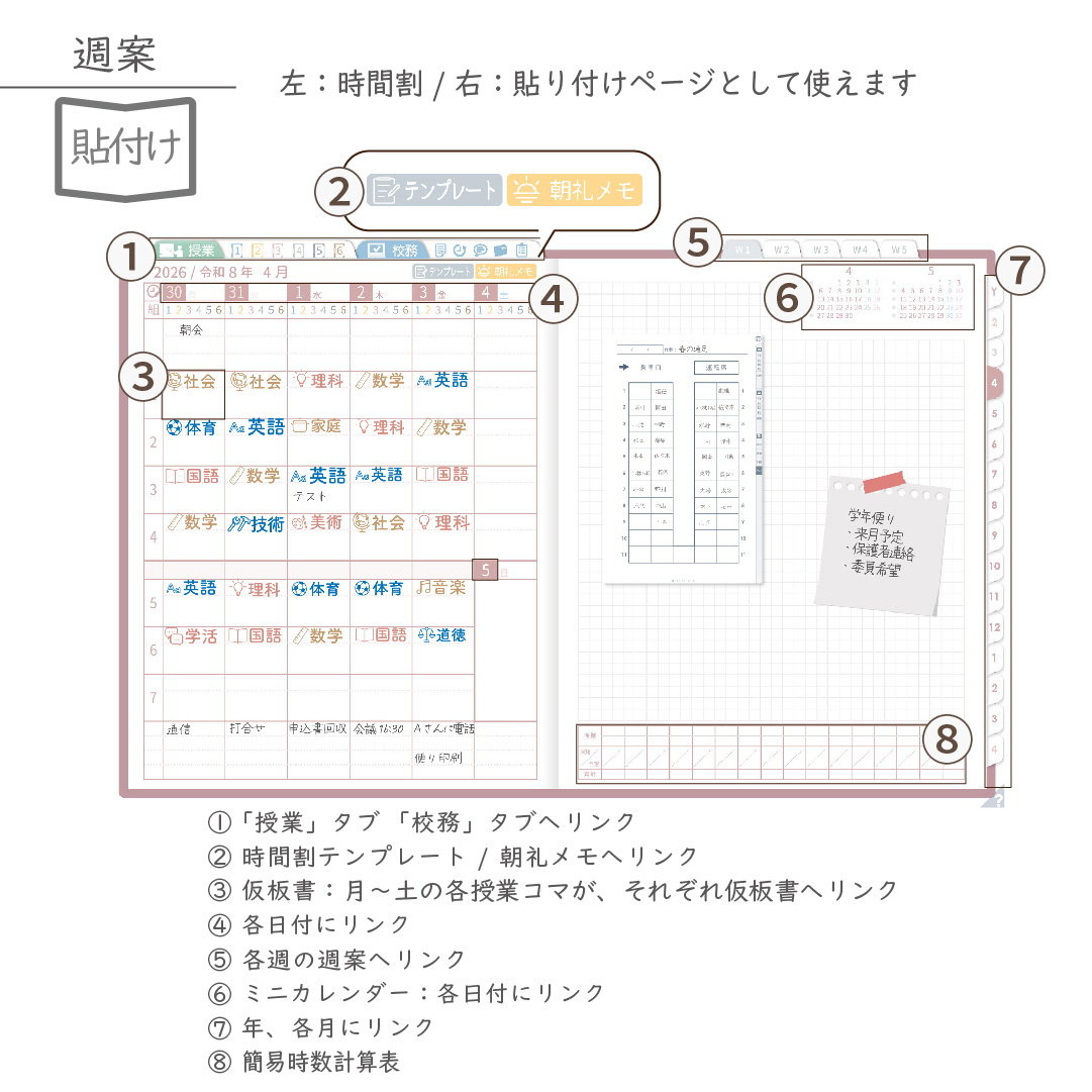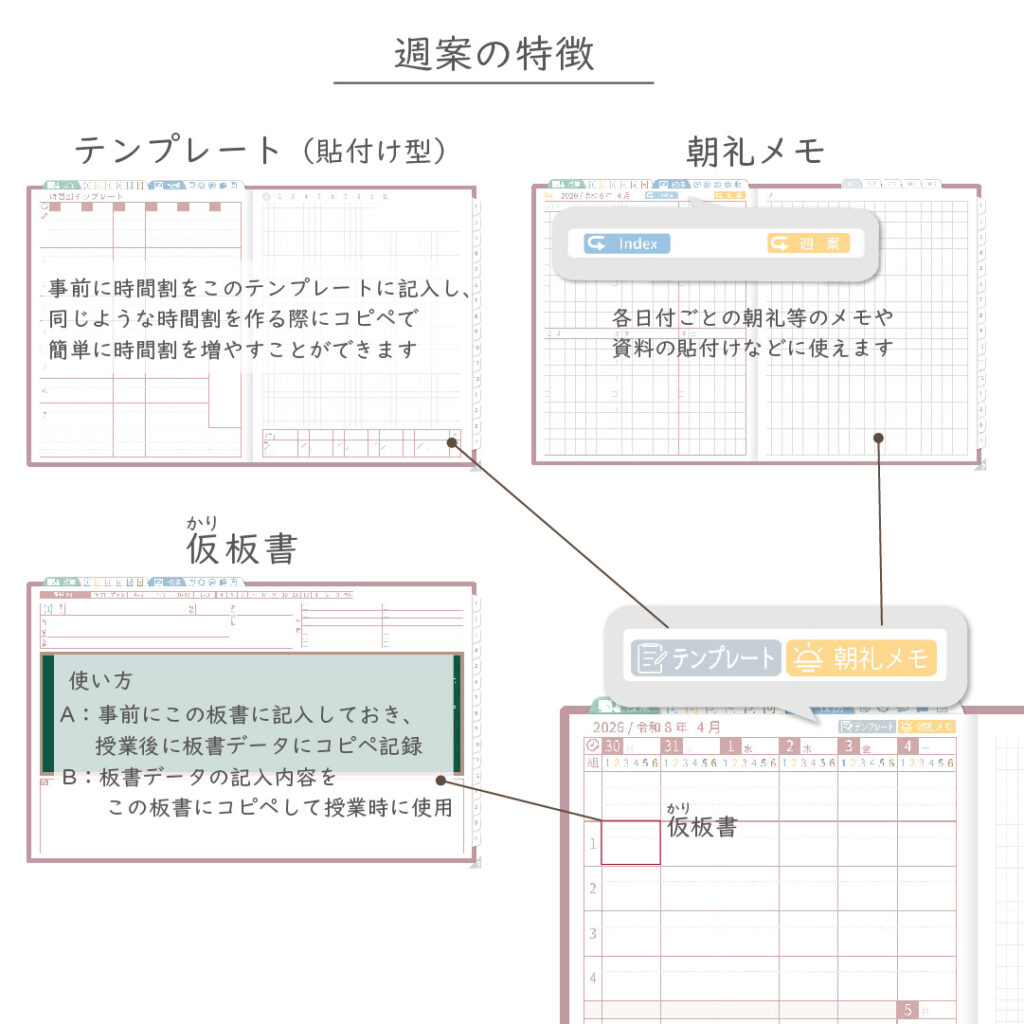 ・週案(※2)は3タイプから選べ、板書ページがリンクで直ぐに開けます