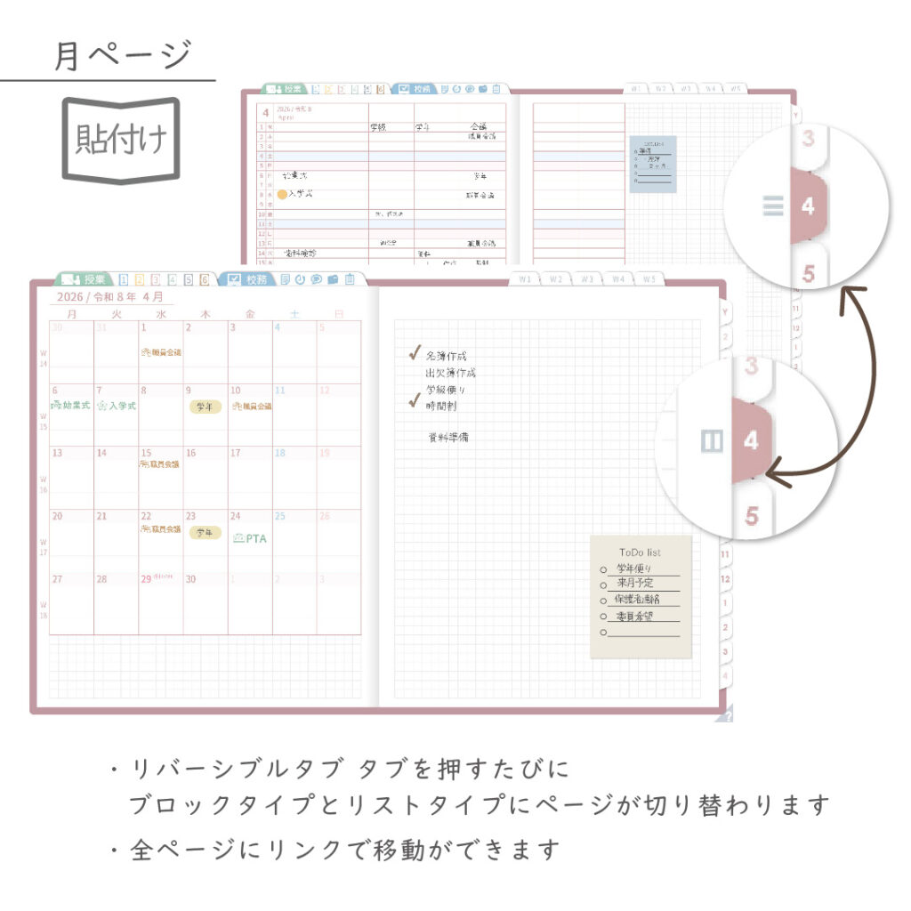 ・年間・月間ページ(※1)はそれぞれリバーシブルで2種類のページを簡単切り替え
