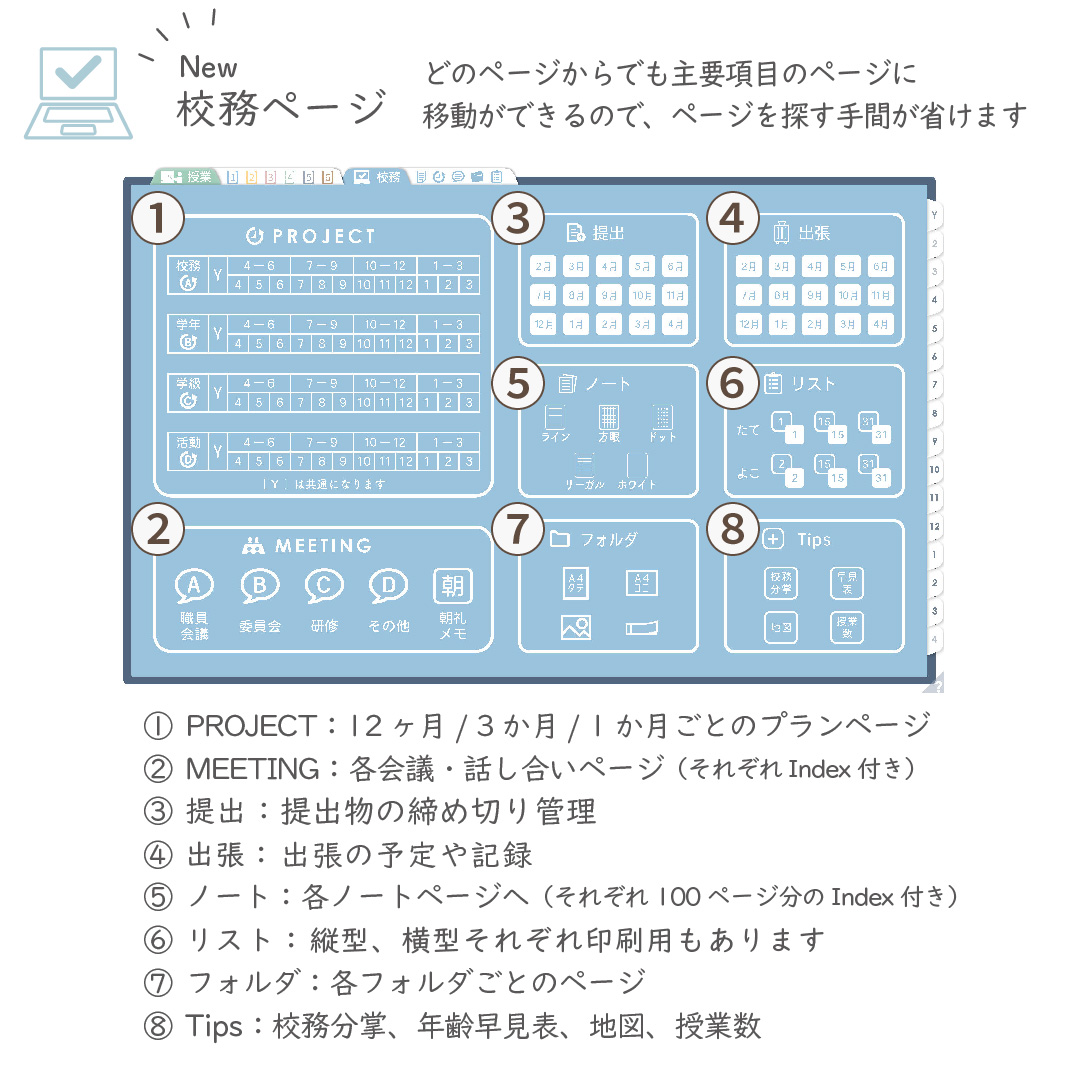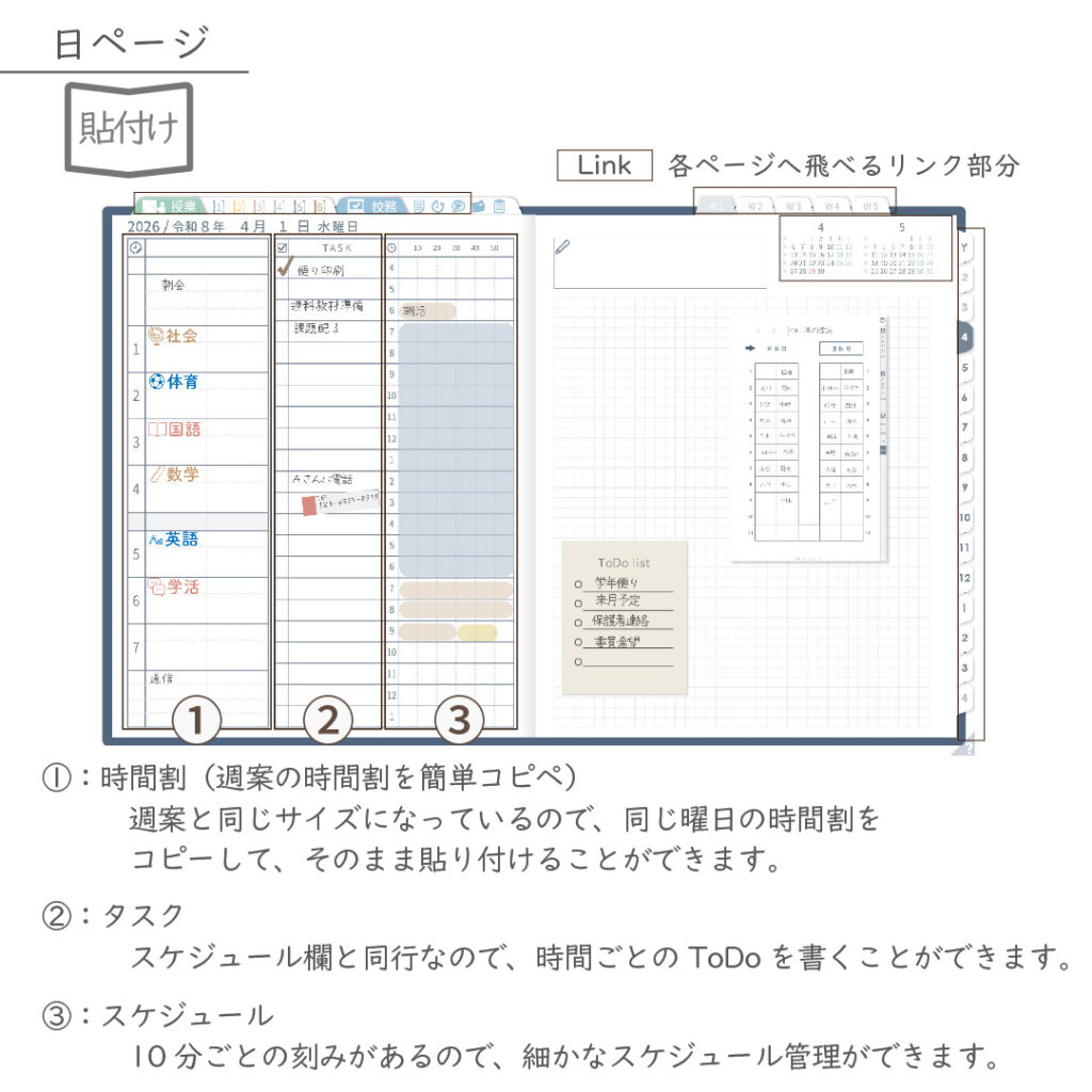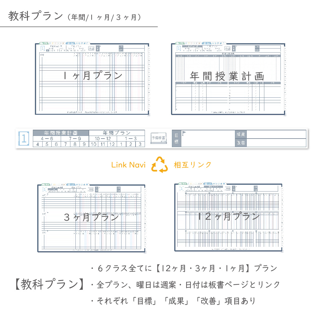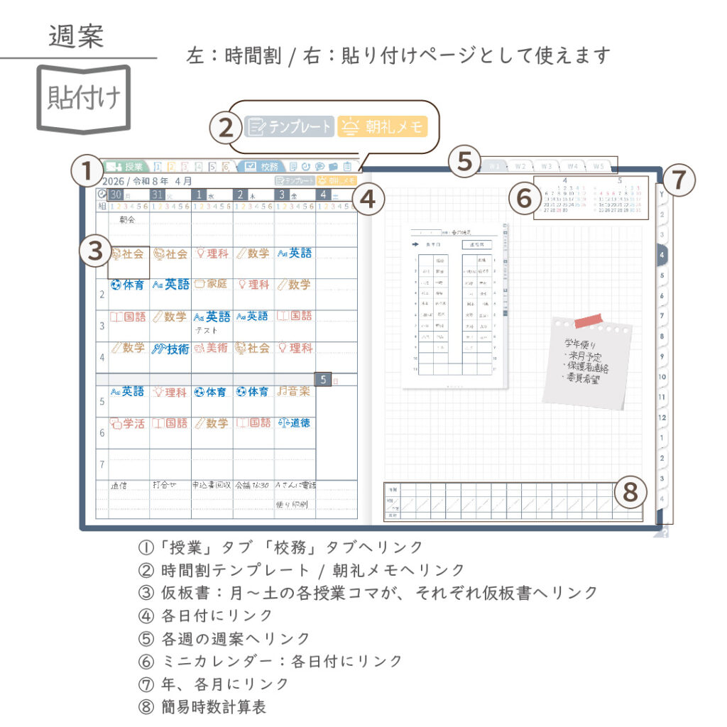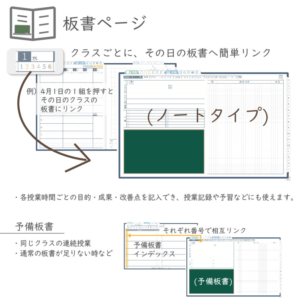 ・週案(※2)は3タイプから選べ、板書ページがリンクで直ぐに開けます