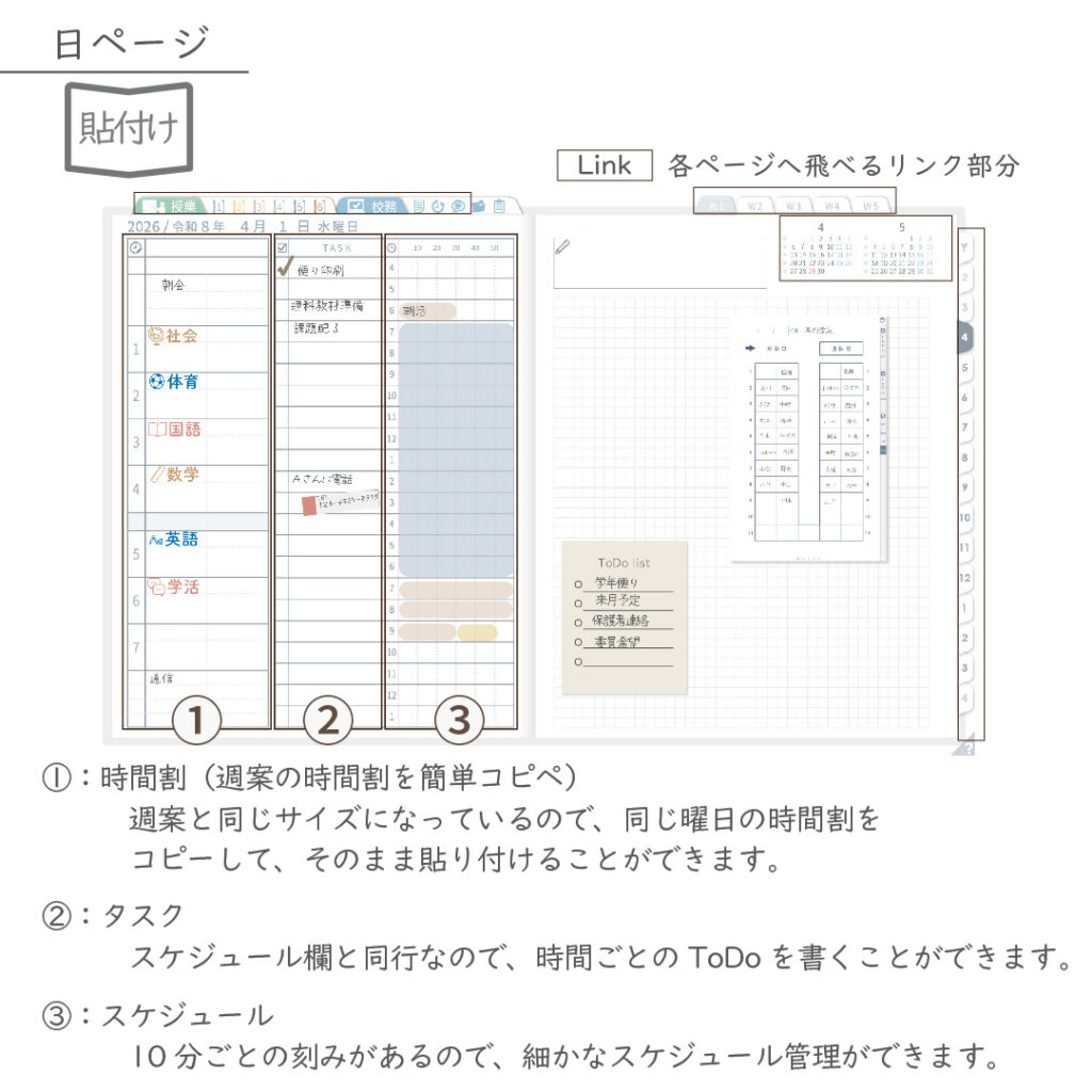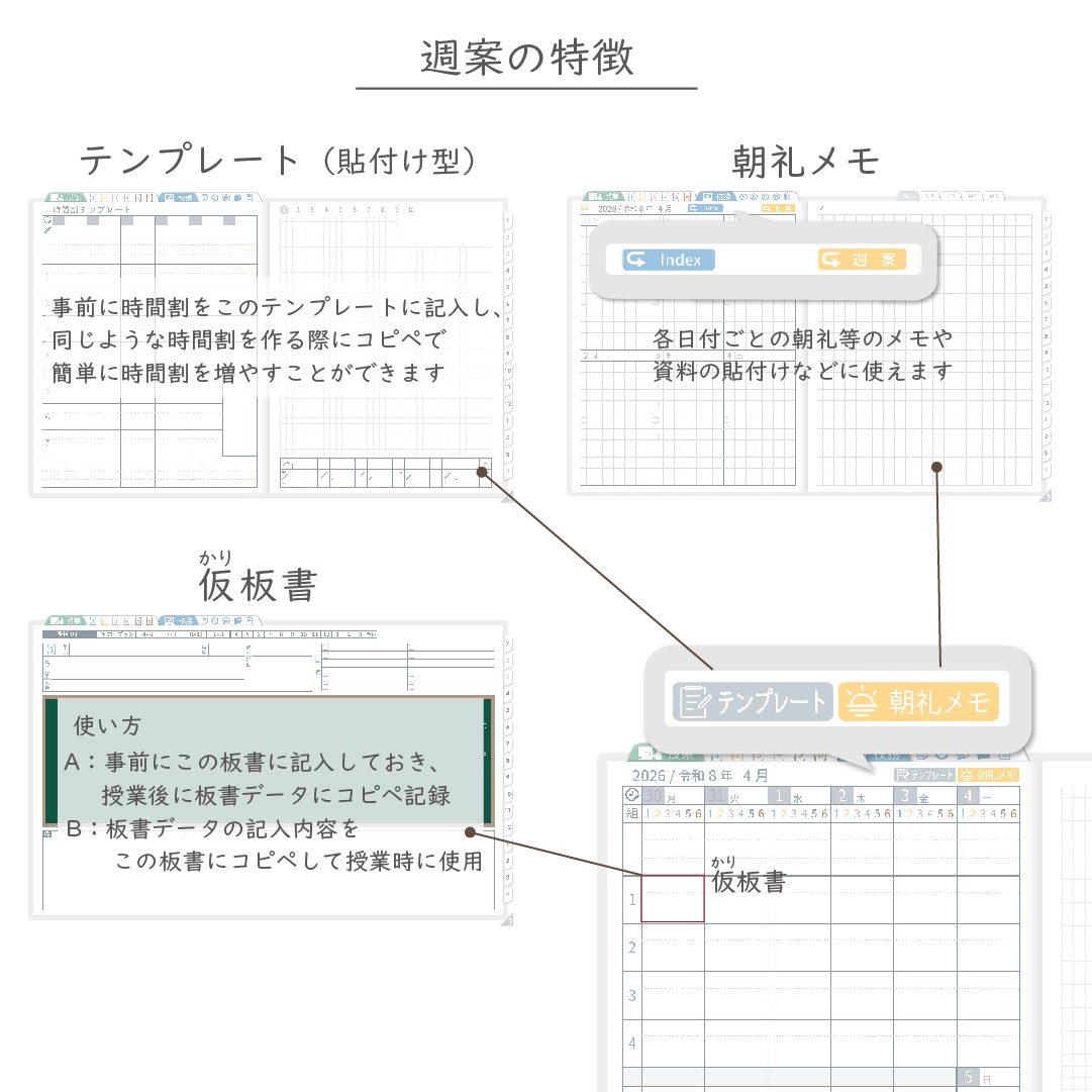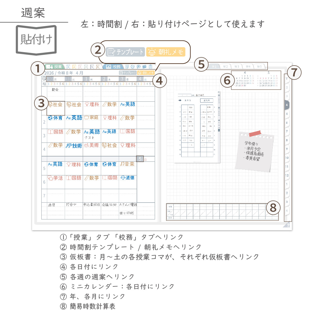 ・週案(※2)は3タイプから選べ、板書ページがリンクで直ぐに開けます