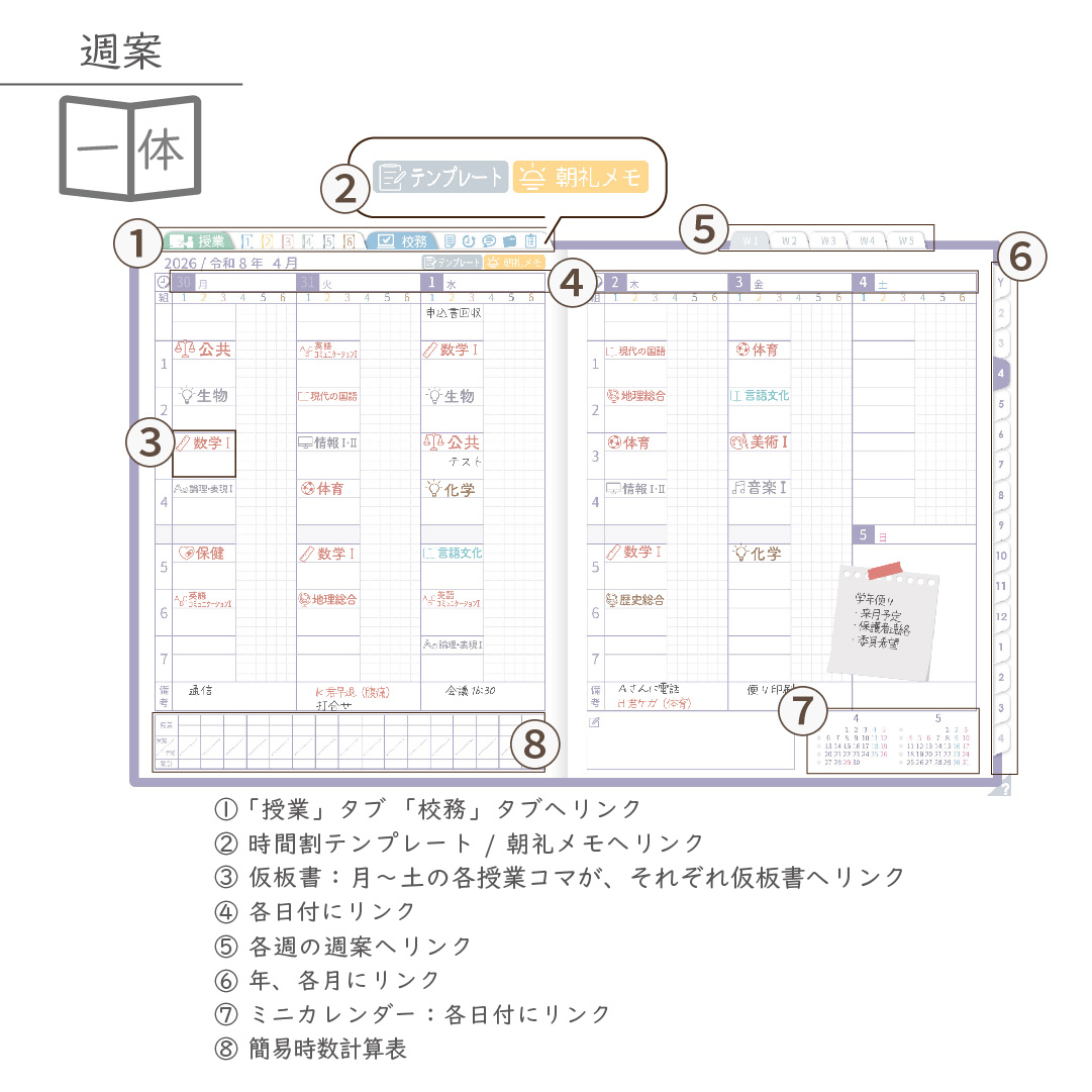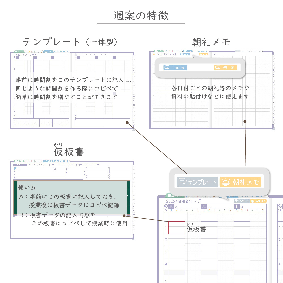 ・週案(※2)は3タイプから選べ、板書ページがリンクで直ぐに開けます