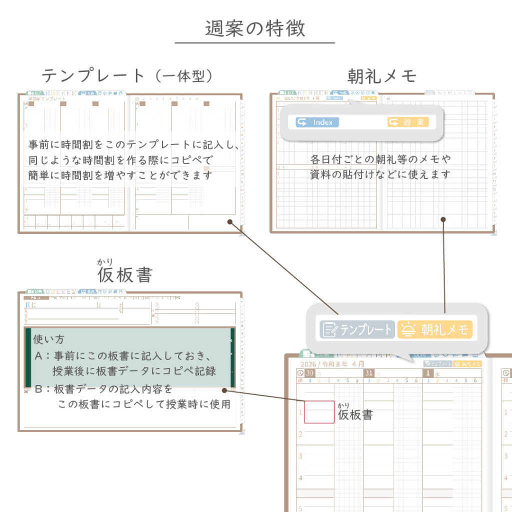 ・週案(※2)は3タイプから選べ、板書ページがリンクで直ぐに開けます