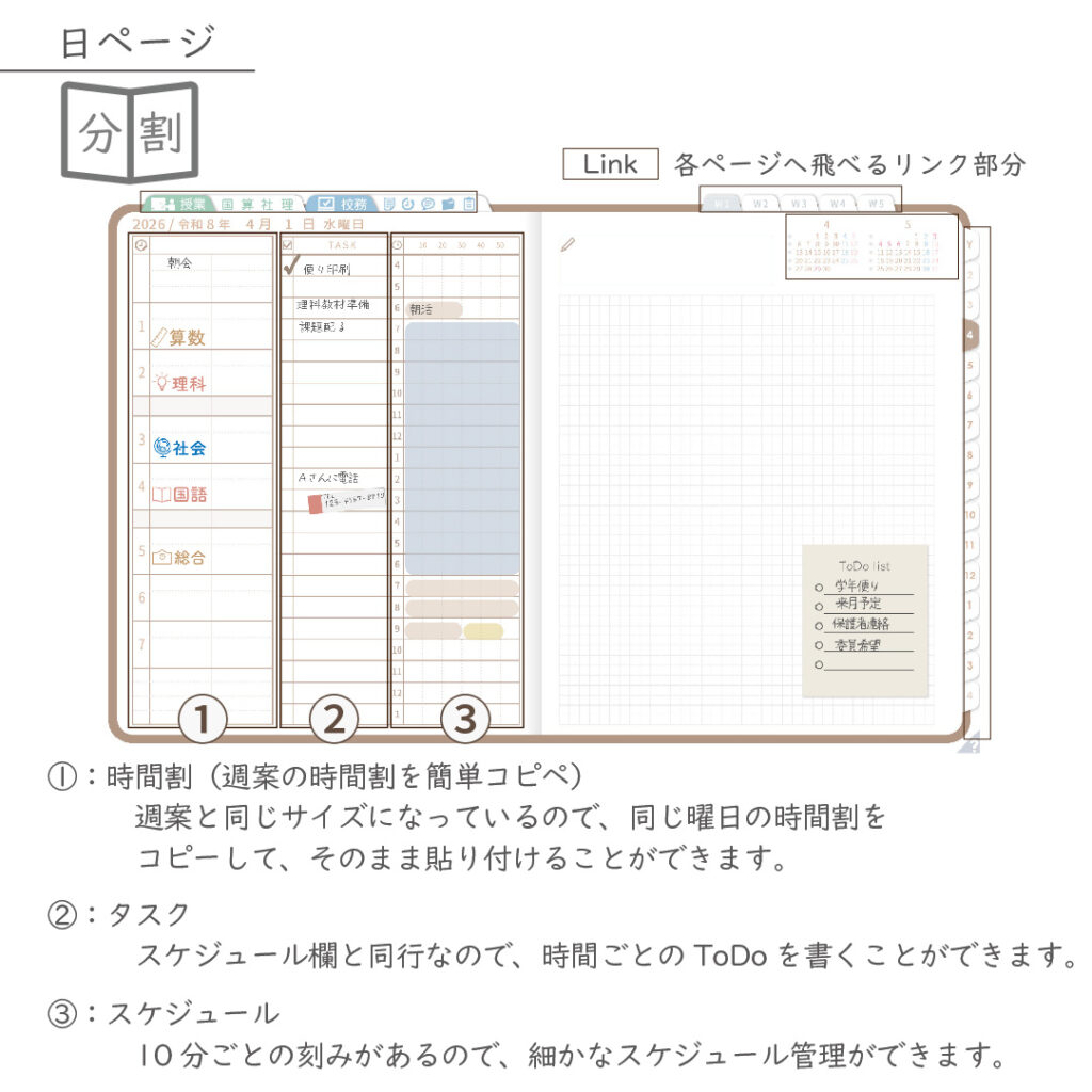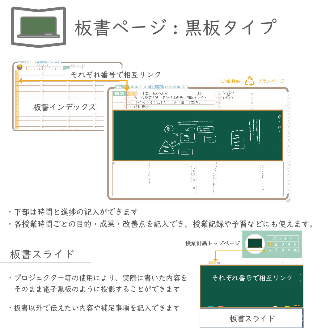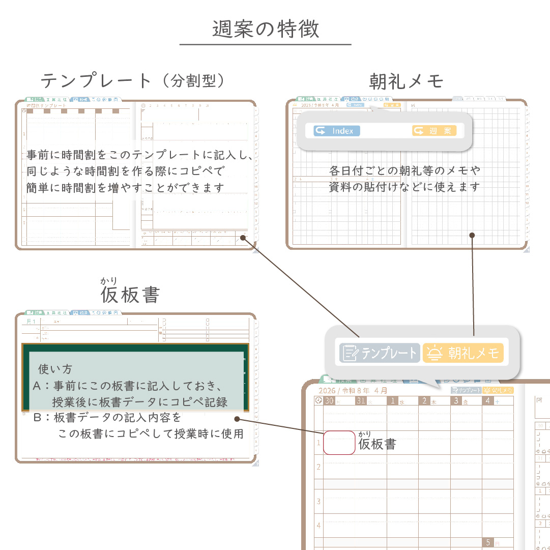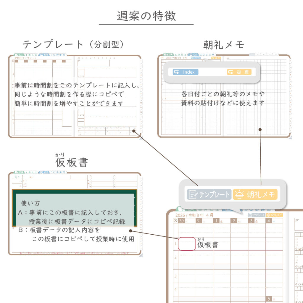・週案(※2)は3タイプから選べ、板書ページがリンクで直ぐに開けます