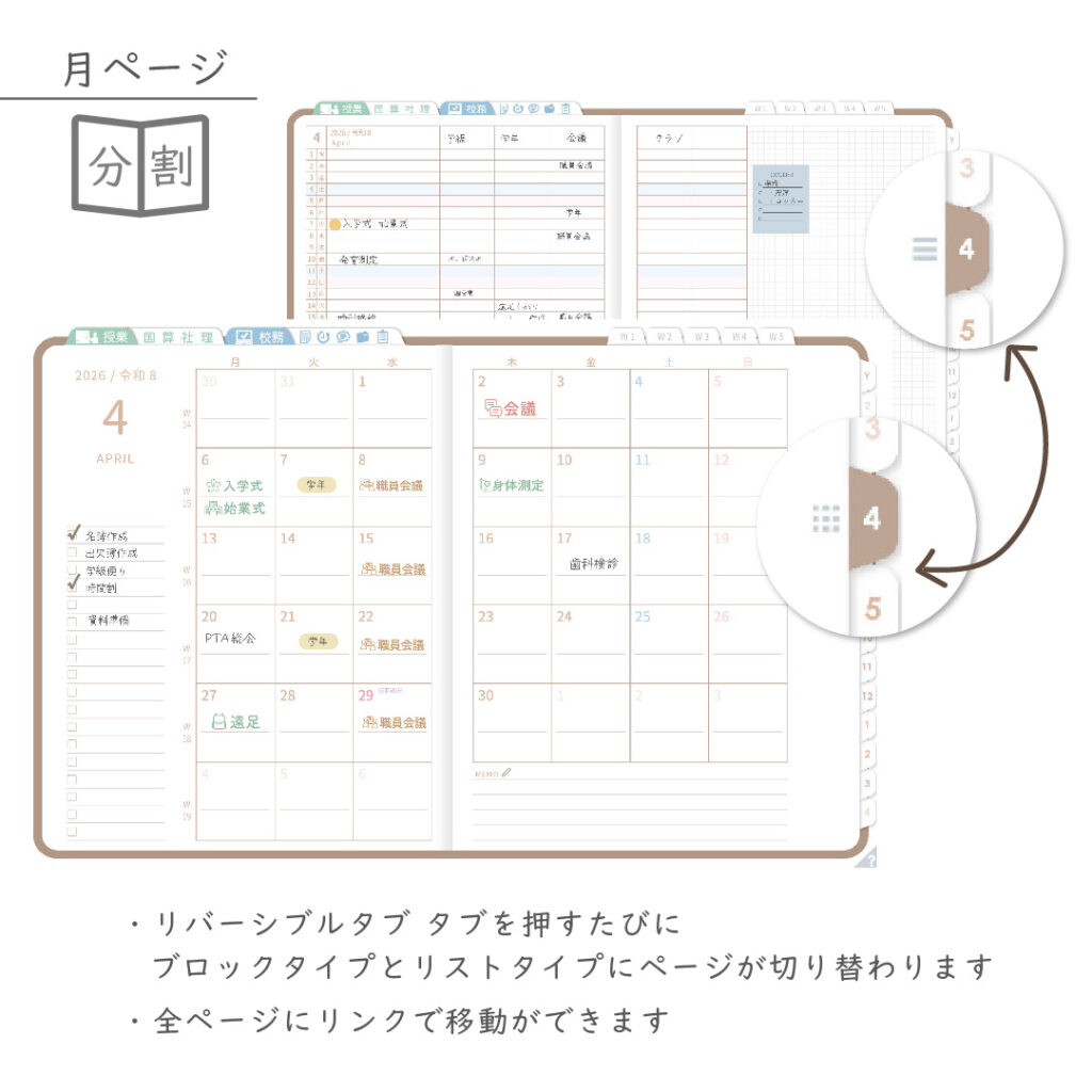 ・年間・月間ページ(※1)はそれぞれリバーシブルで2種類のページを簡単切り替え