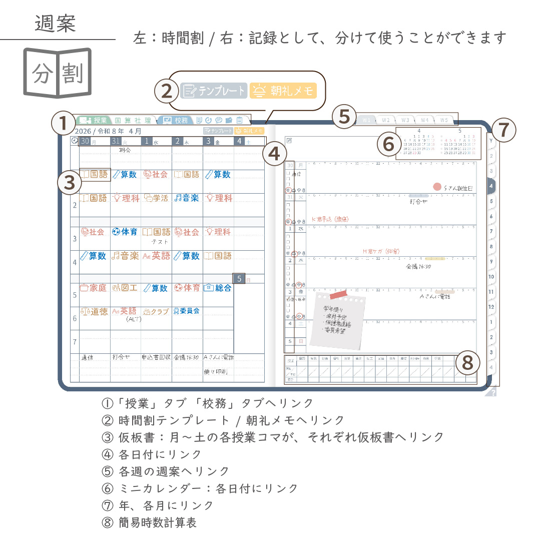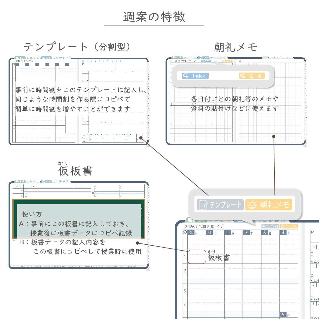 ・週案(※2)は3タイプから選べ、板書ページがリンクで直ぐに開けます