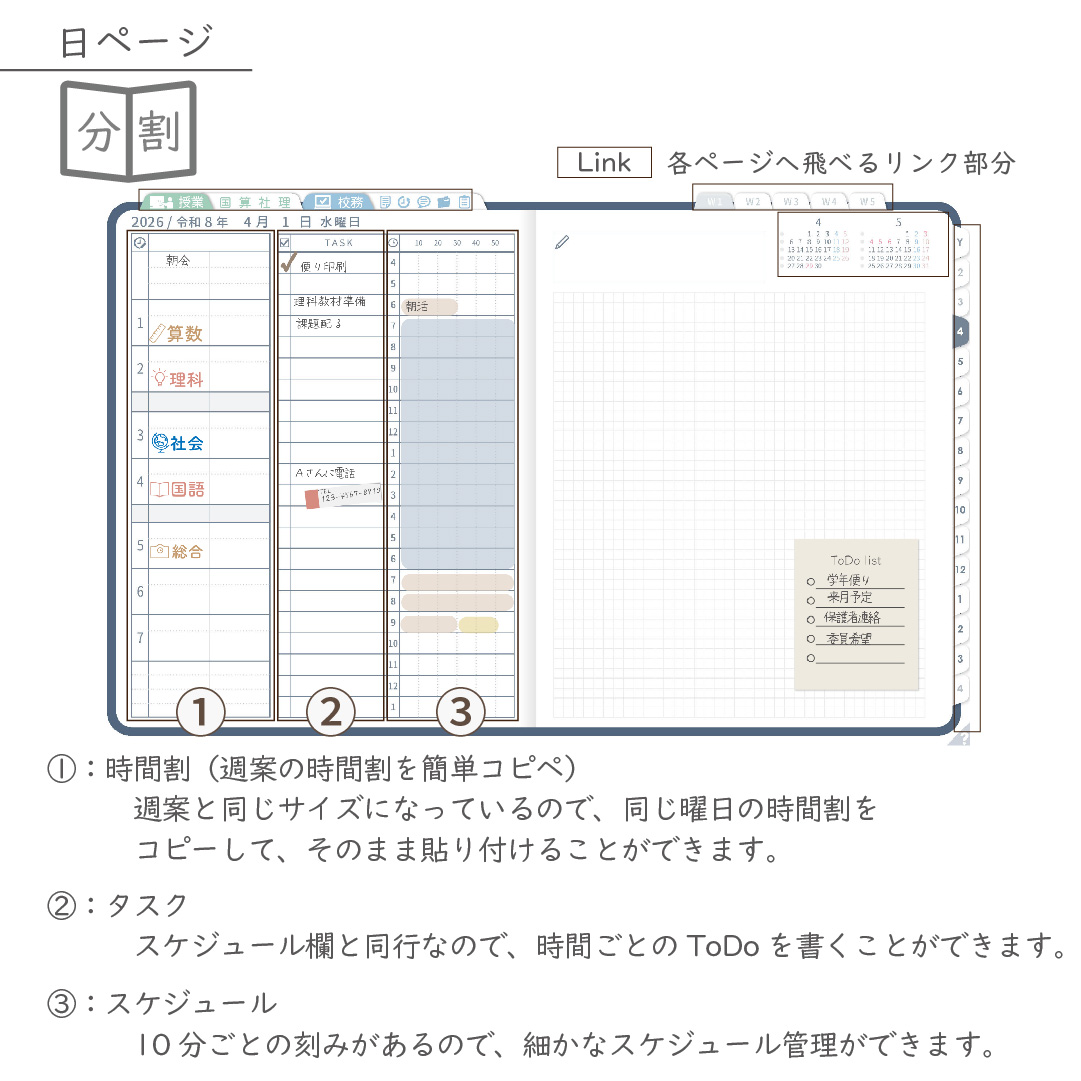 ※2:1週間見開きタイプ/週案+記録の分割タイプ/週案+貼付けスペースの貼付けタイプ