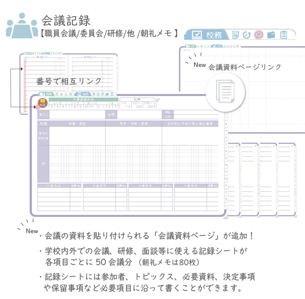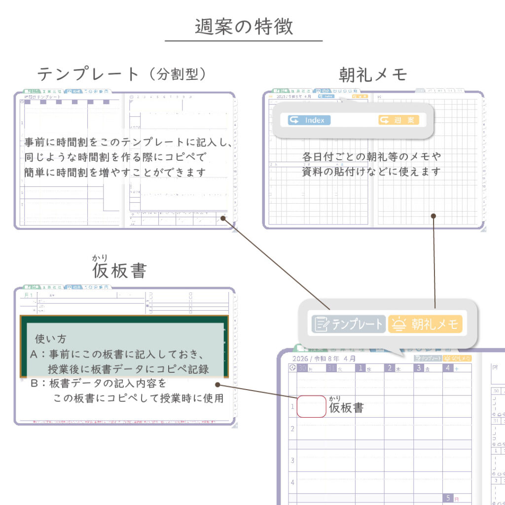 ・週案(※2)は3タイプから選べ、板書ページがリンクで直ぐに開けます