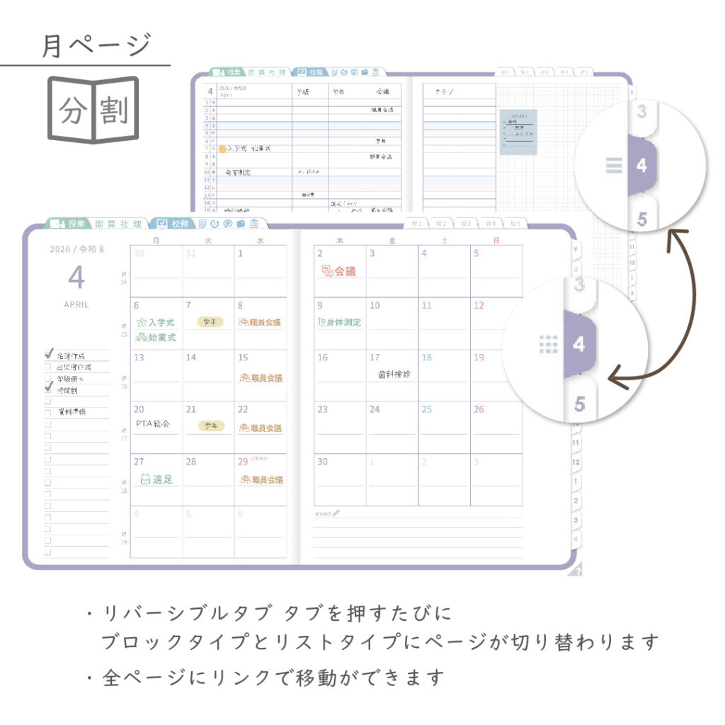 ・年間・月間ページ(※1)はそれぞれリバーシブルで2種類のページを簡単切り替え