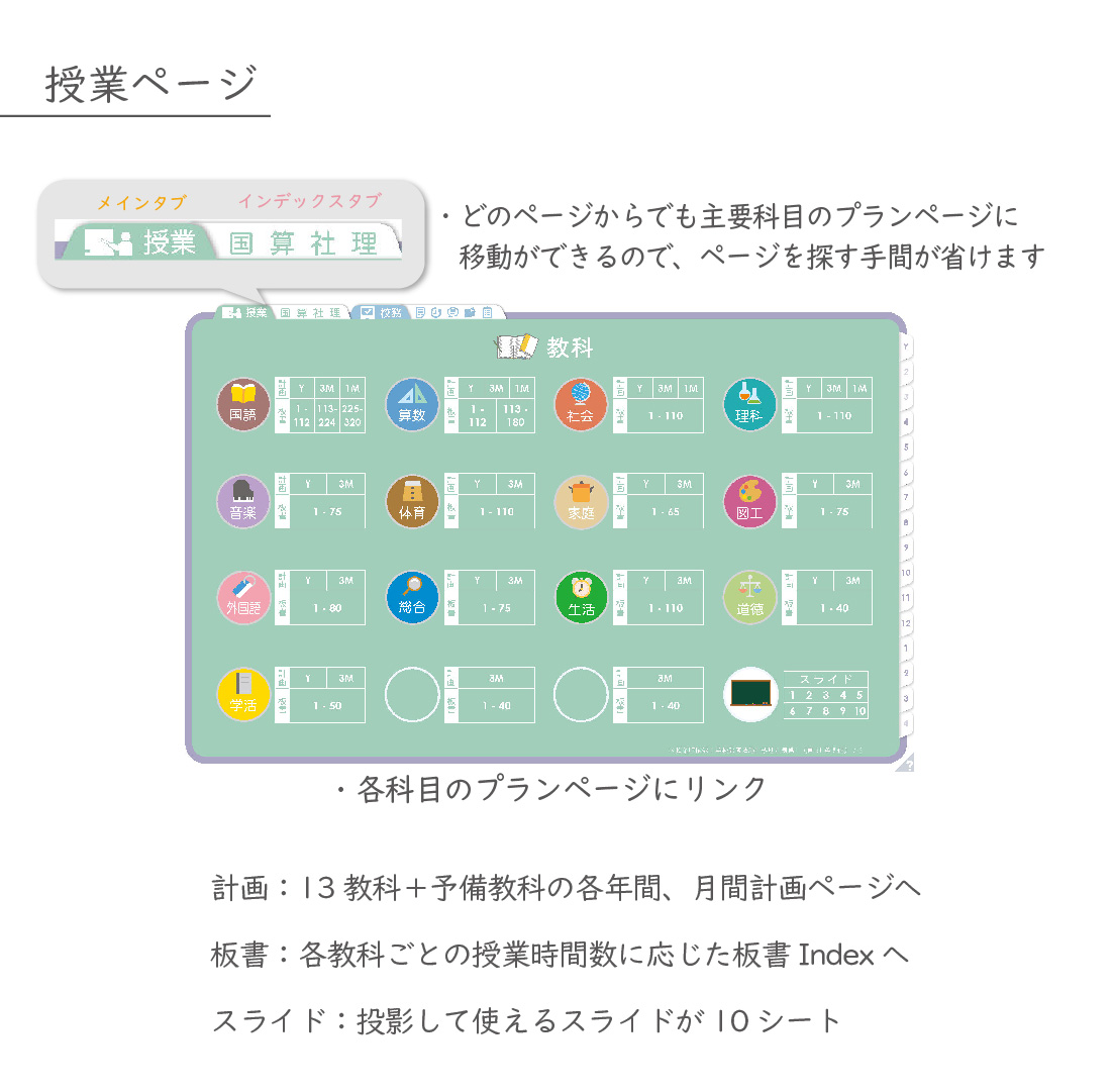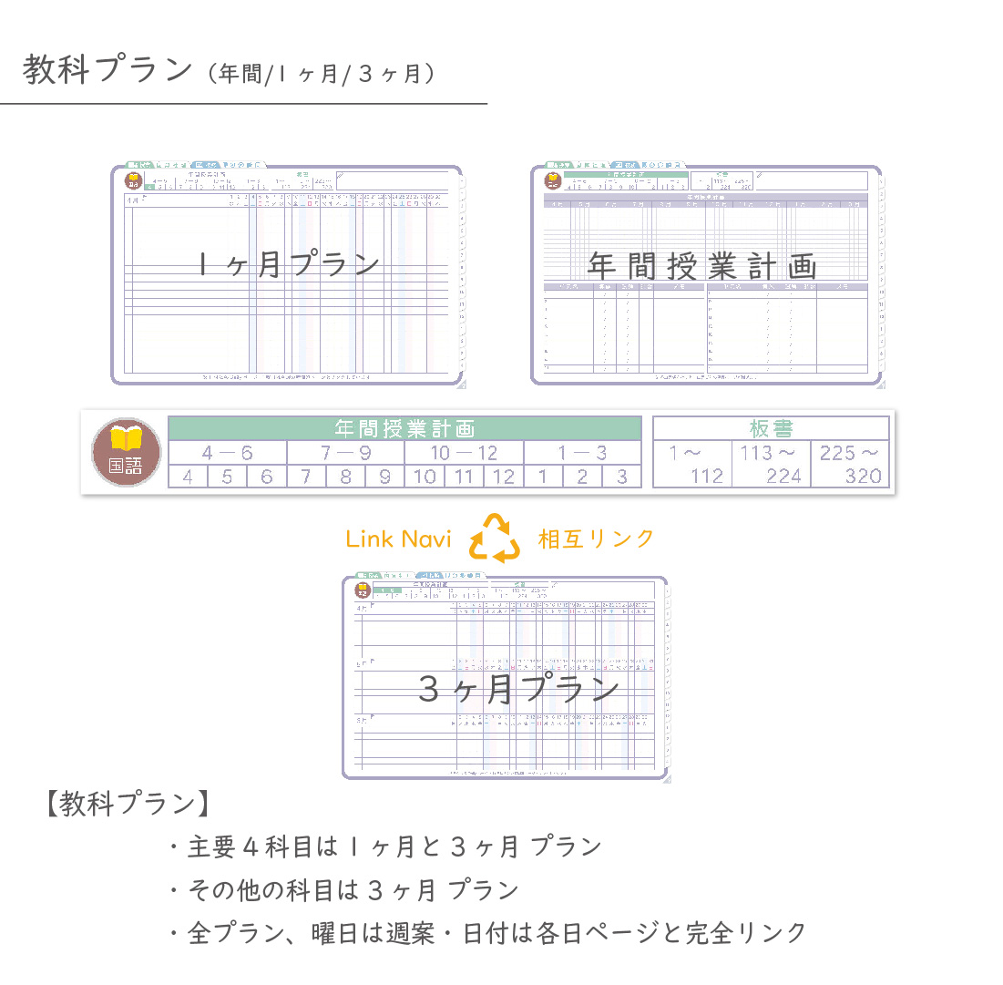 ・13教科+2教科(予備)全てに年間・月間計画と単元シートに加え授業数分の板書(※3)がセット