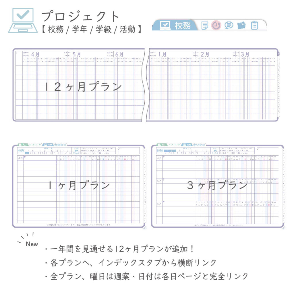 ・校務、学年、学級、活動など内容ごとに3ヶ月+1ヶ月ごとのプロジェクトシート