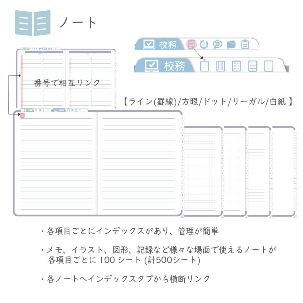 ・ノートは分けて使える5種類x100ページ分