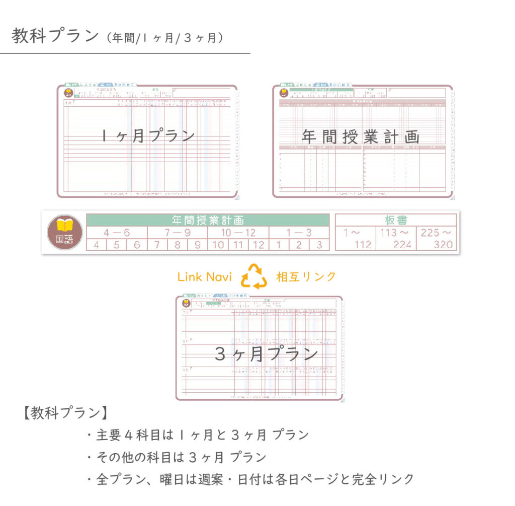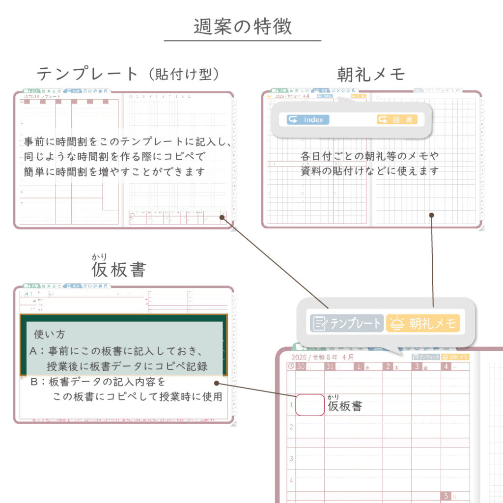 ・週案(※2)は3タイプから選べ、板書ページがリンクで直ぐに開けます