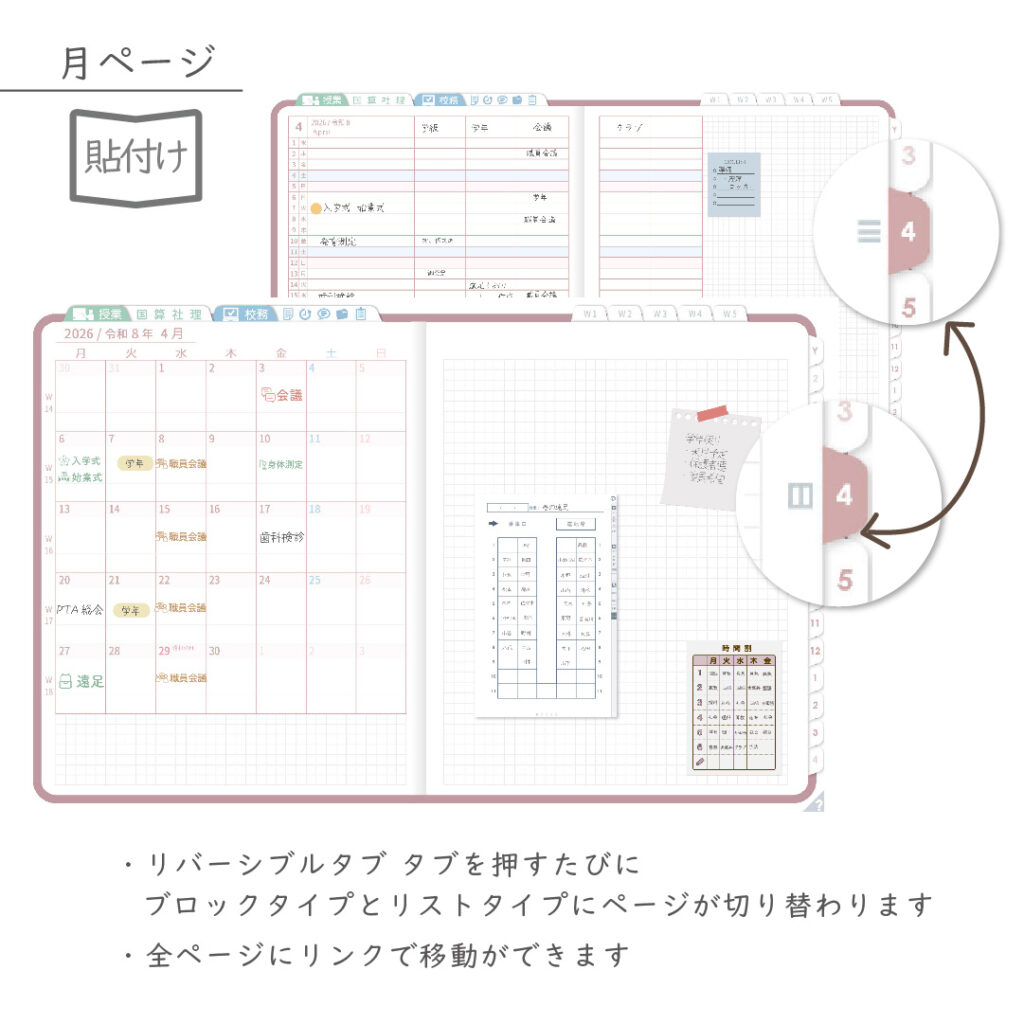 ・年間・月間ページ(※1)はそれぞれリバーシブルで2種類のページを簡単切り替え