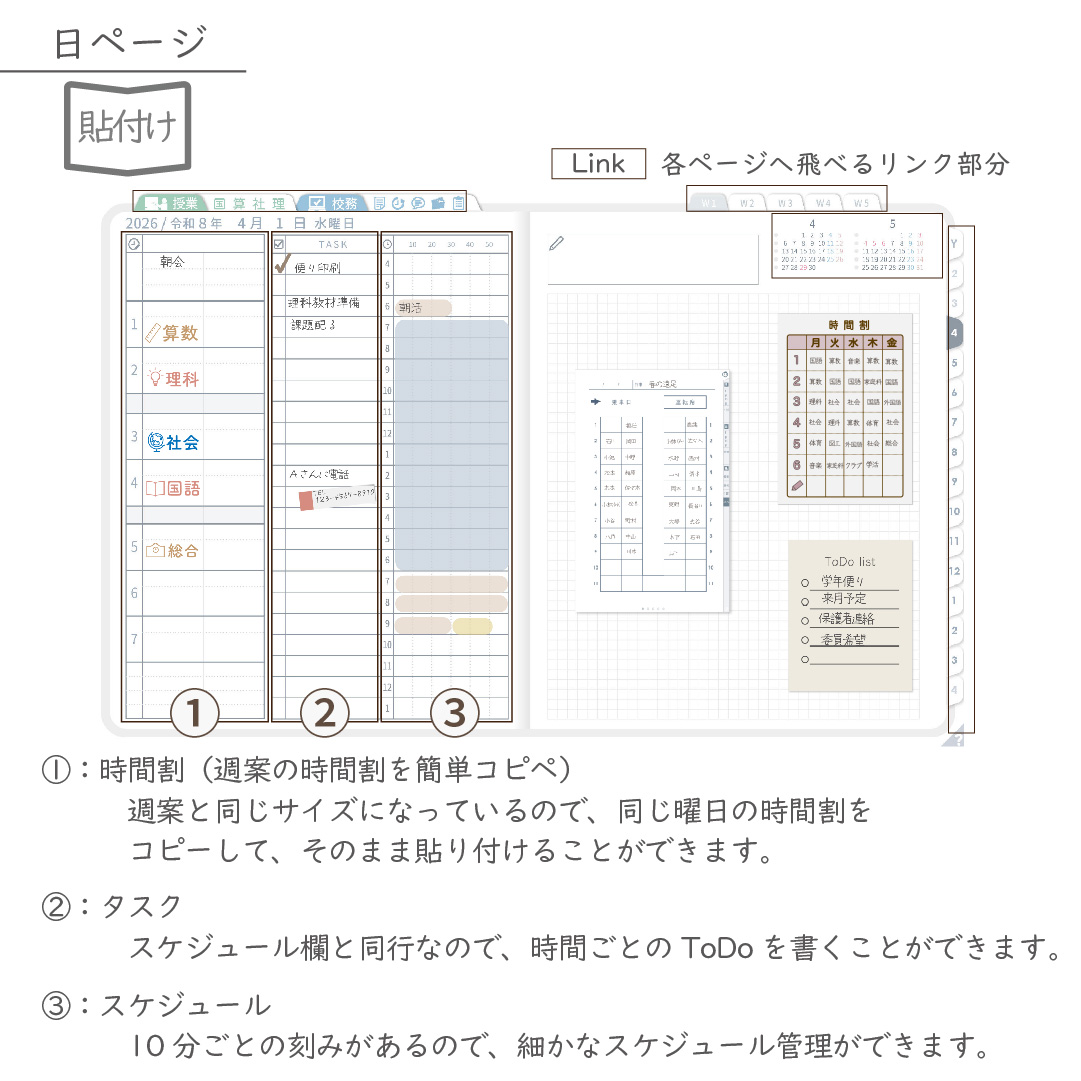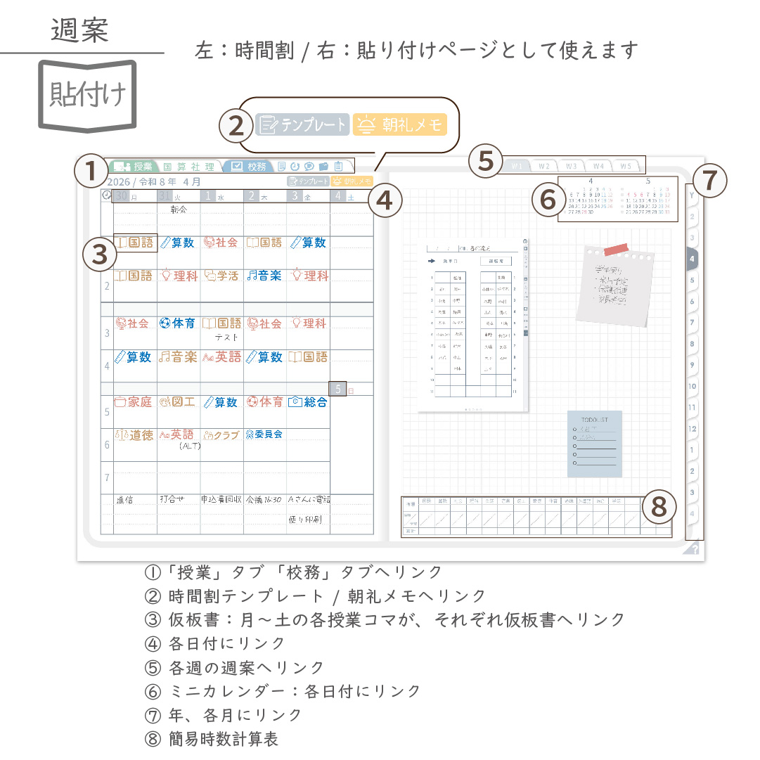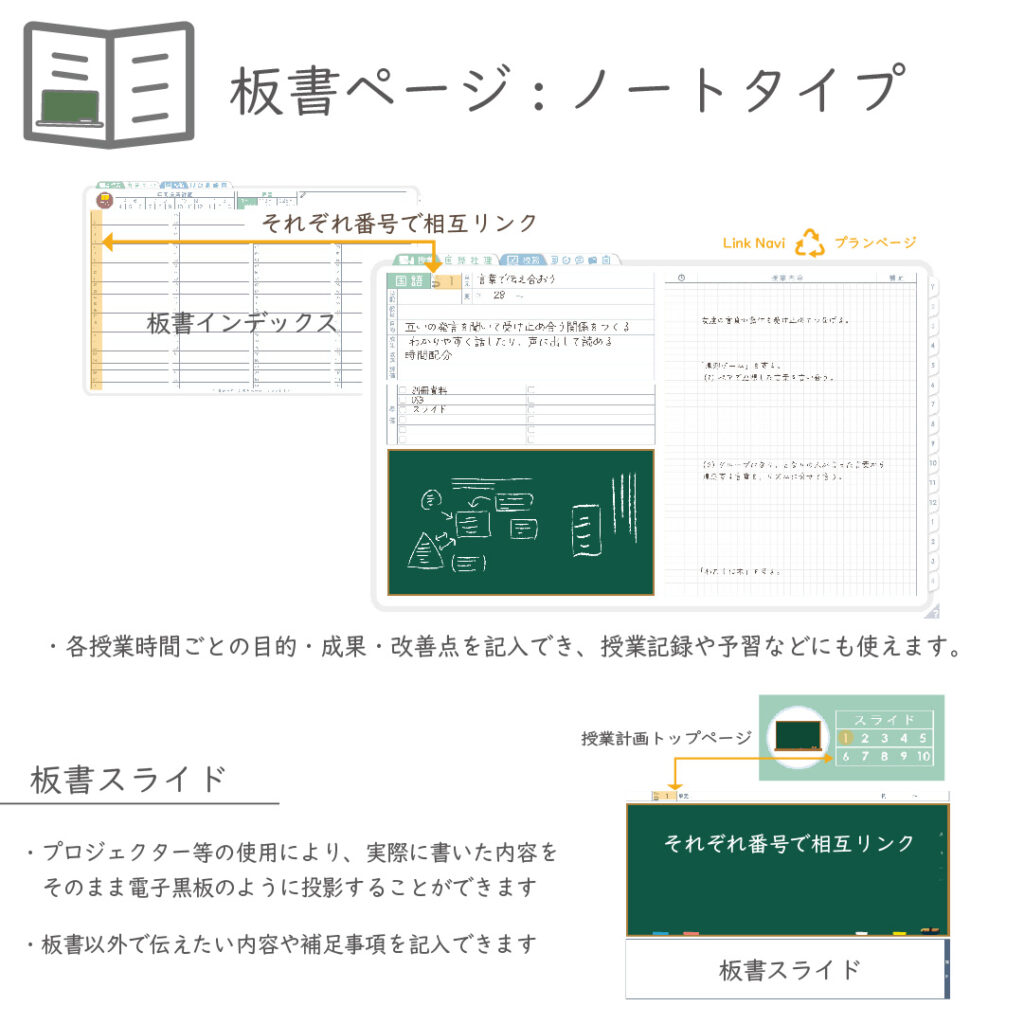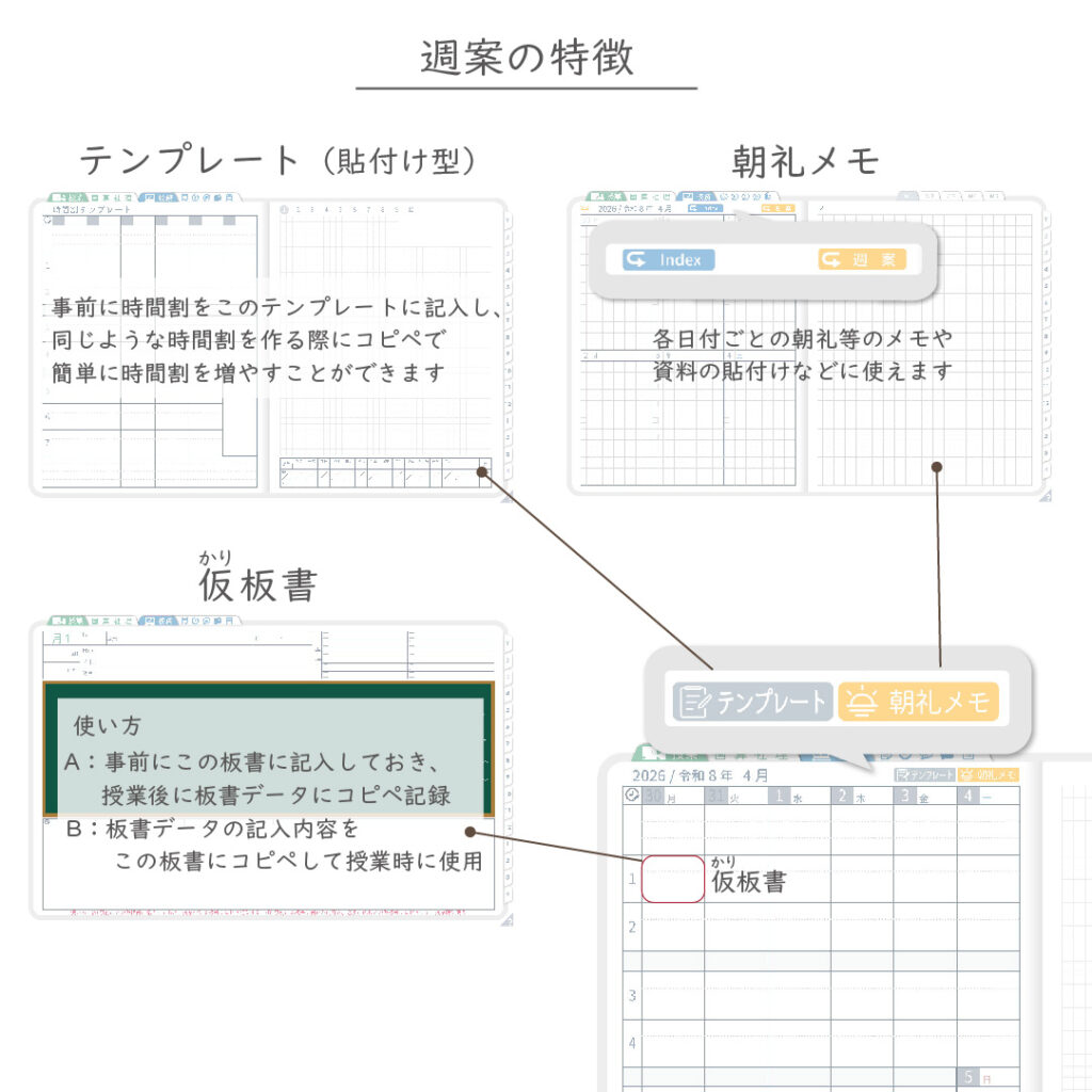 ・週案(※2)は3タイプから選べ、板書ページがリンクで直ぐに開けます