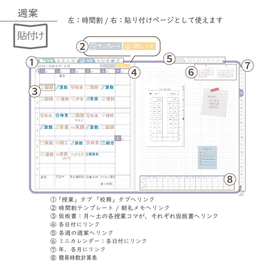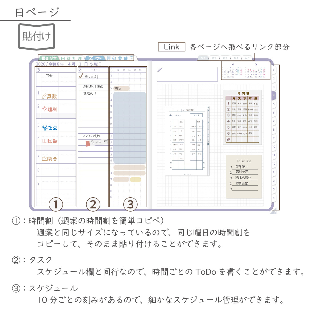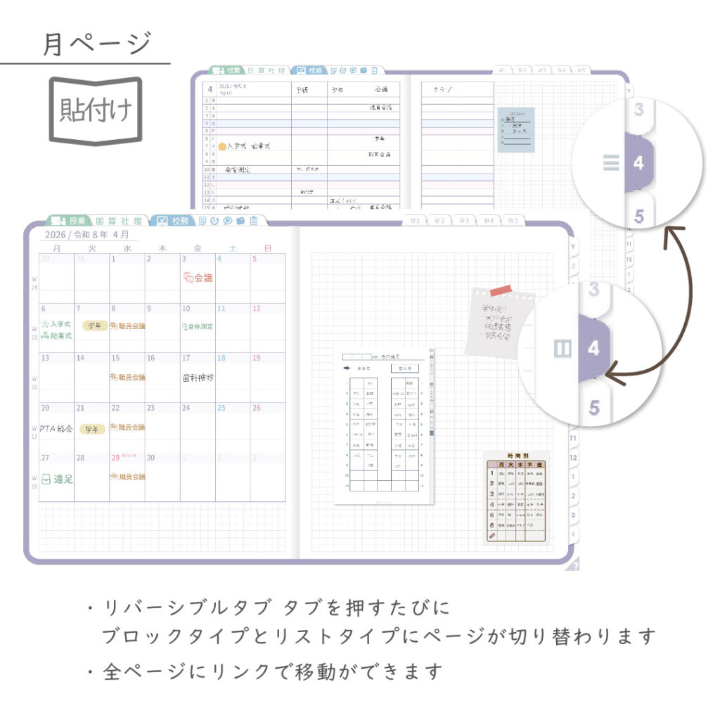 2026年度「先生手帳(小学校版)」【レギュラー:貼付け/ノート】【色:スミレ】