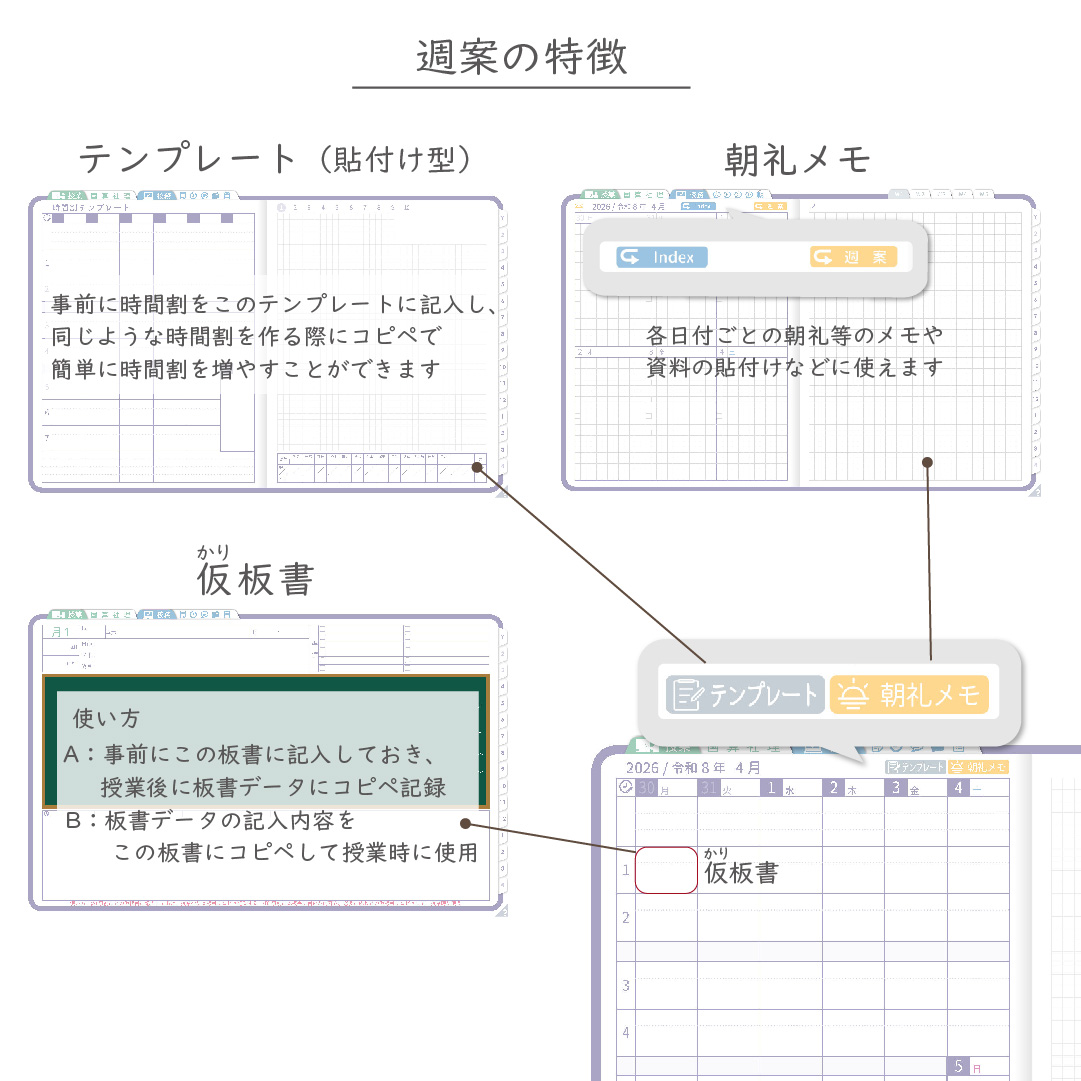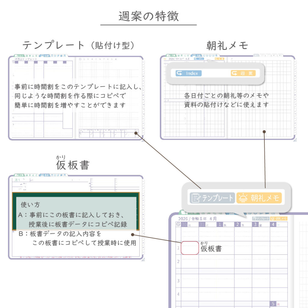 ・週案(※2)は3タイプから選べ、板書ページがリンクで直ぐに開けます