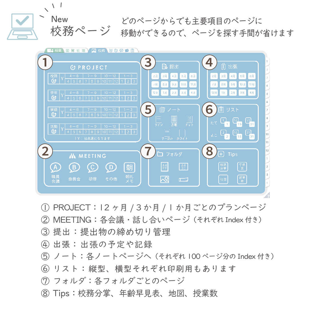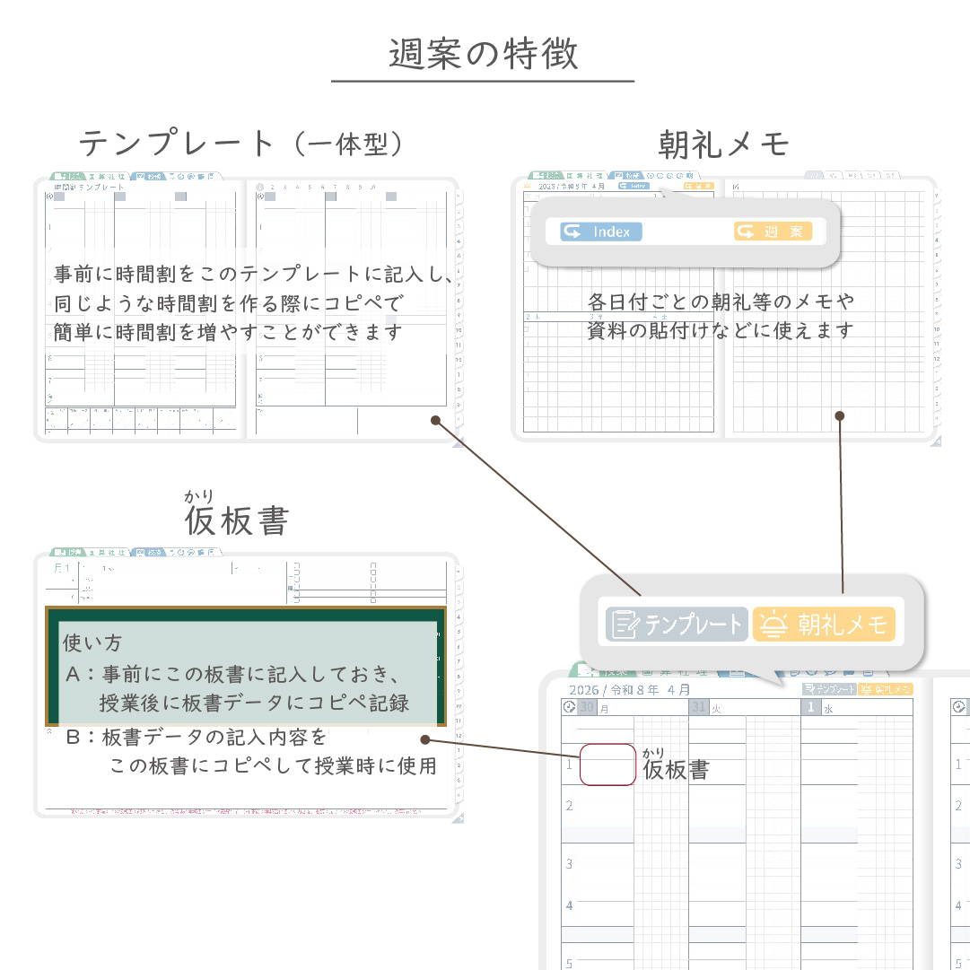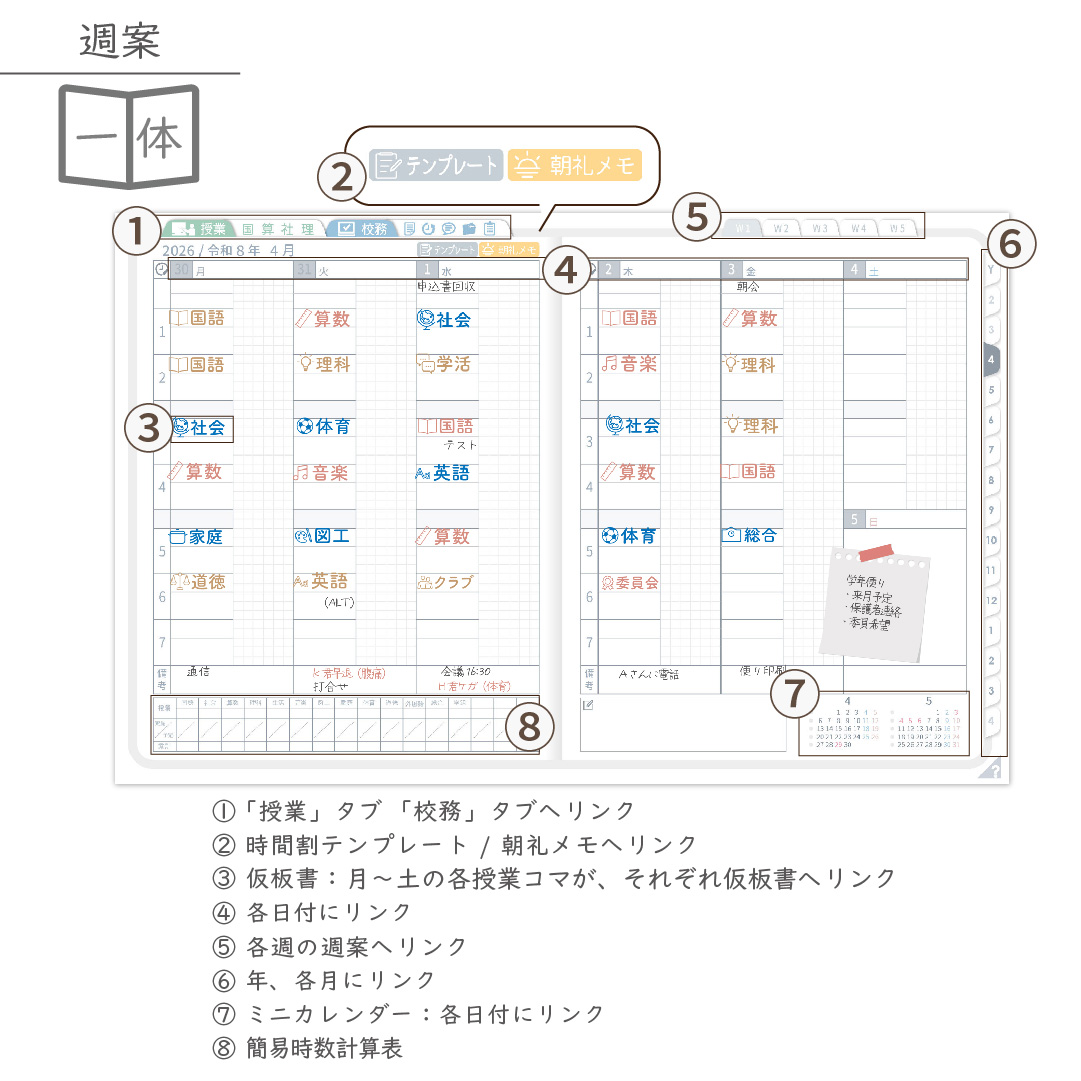 ・週案(※2)は3タイプから選べ、板書ページがリンクで直ぐに開けます