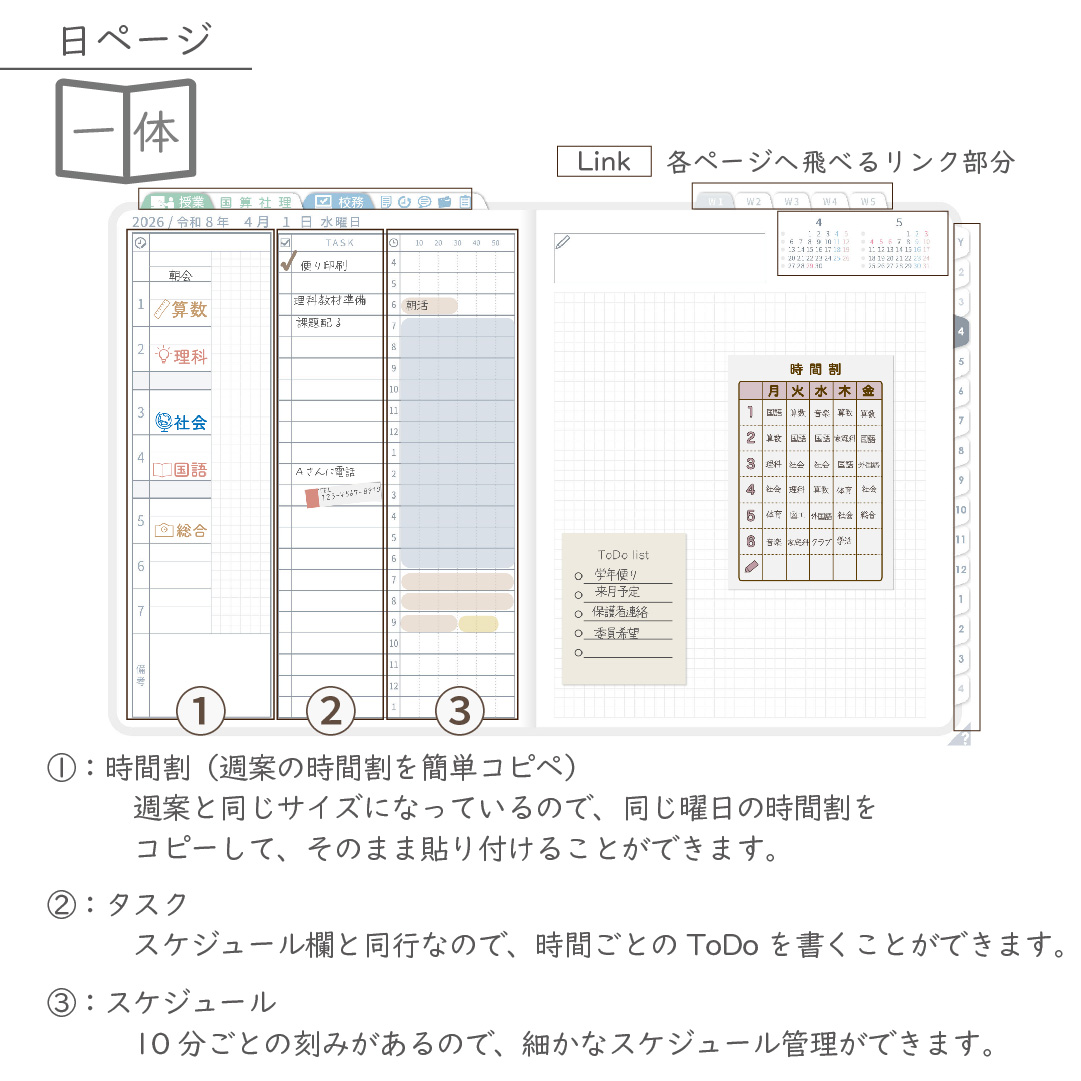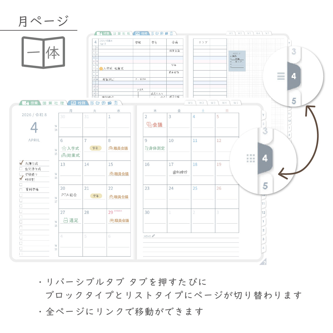 2026年度「先生手帳(小学校版)」【レギュラー:一体/黒板】【色:スノー】