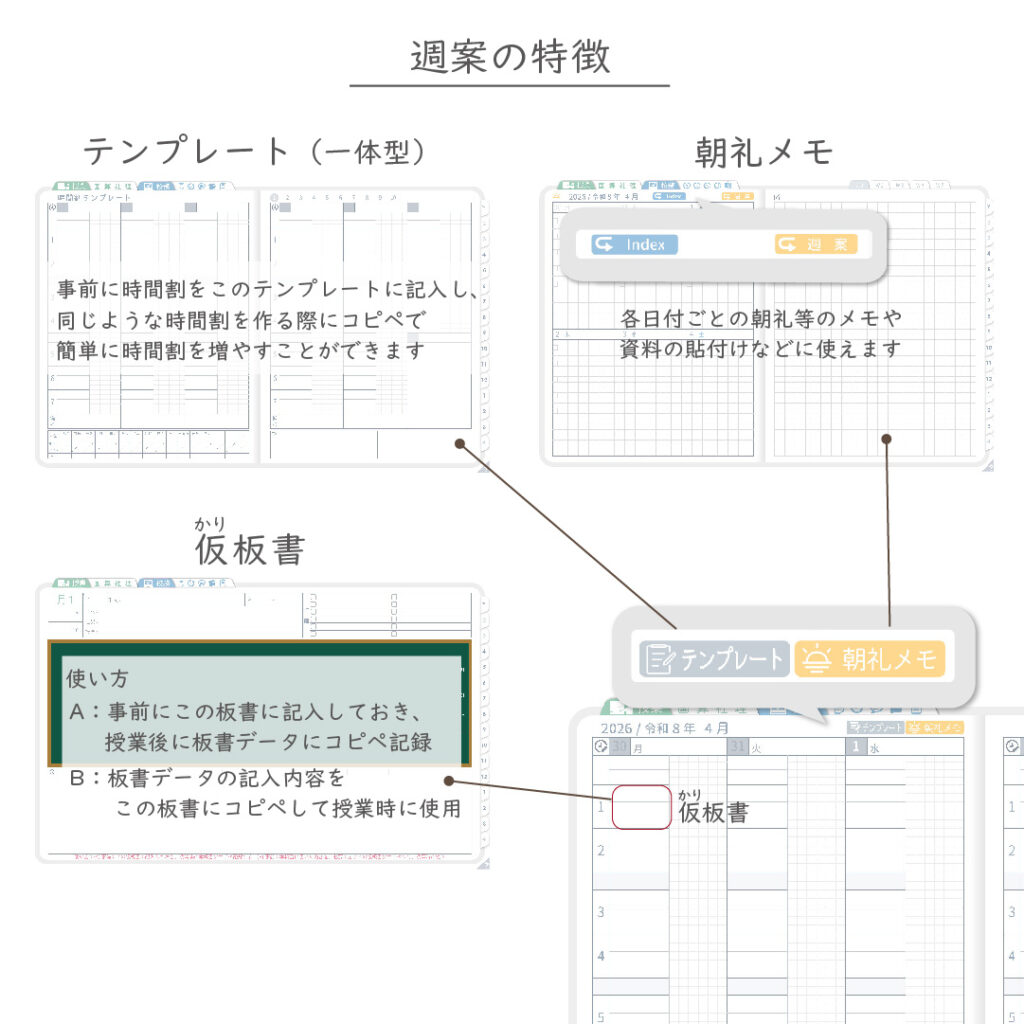 ・週案(※2)は3タイプから選べ、板書ページがリンクで直ぐに開けます