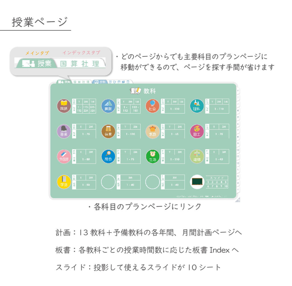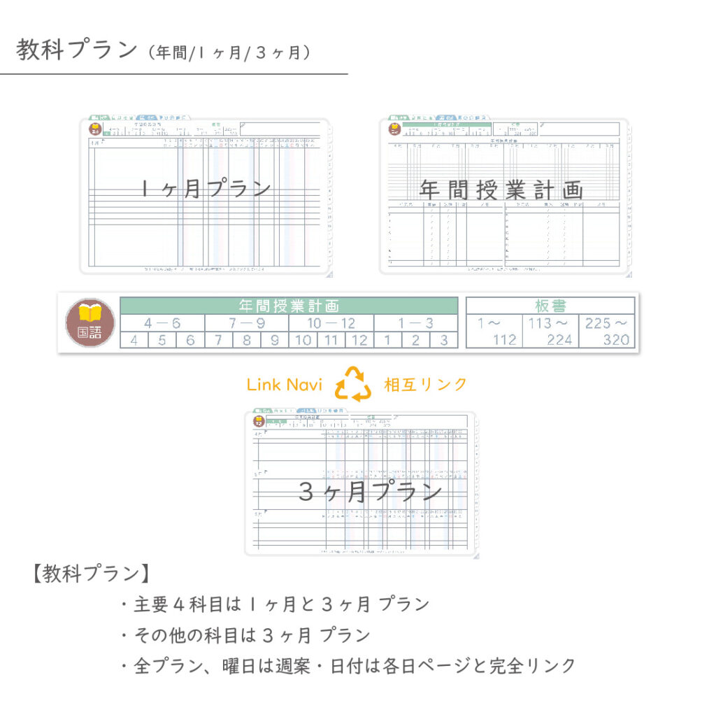 ・13教科+2教科(予備)全てに年間・月間計画と単元シートに加え授業数分の板書(※3)がセット