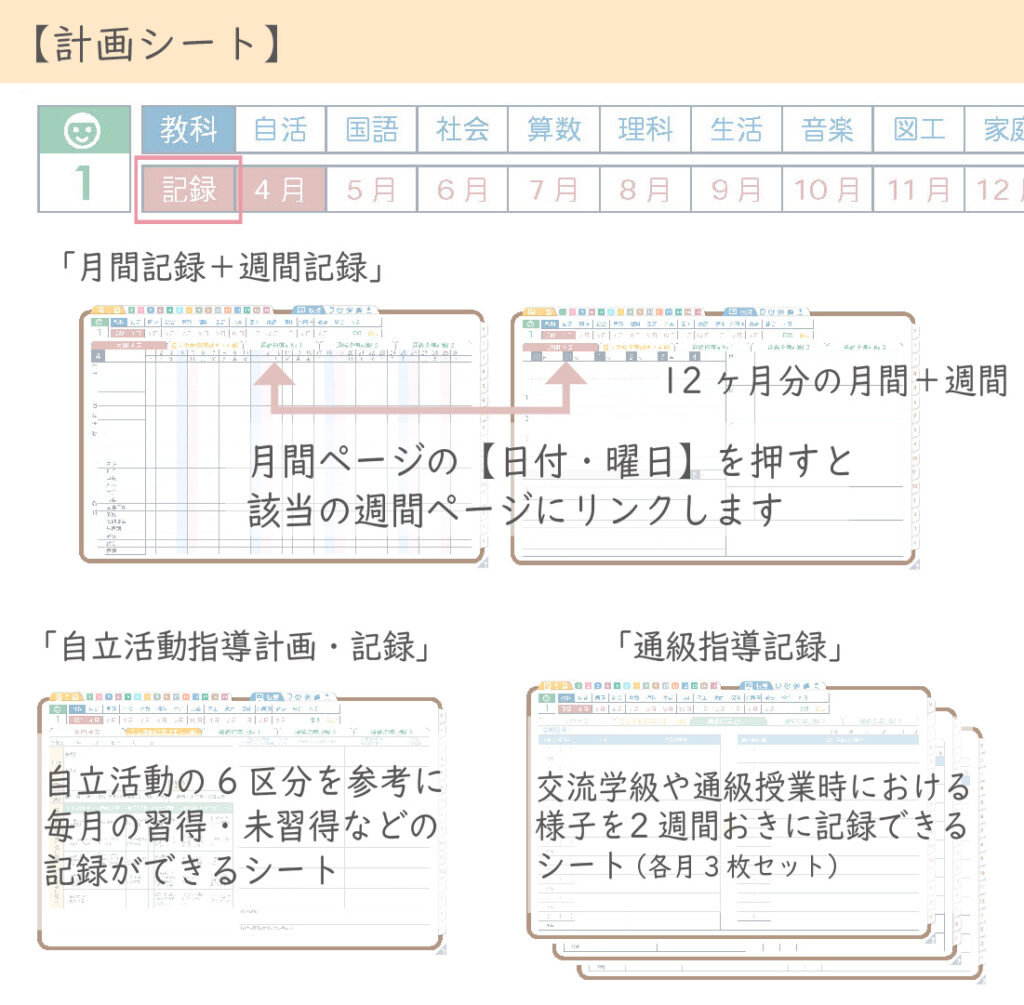 交流学級・通級授業時の様子を、月3枚(2週間ごと)記録可能