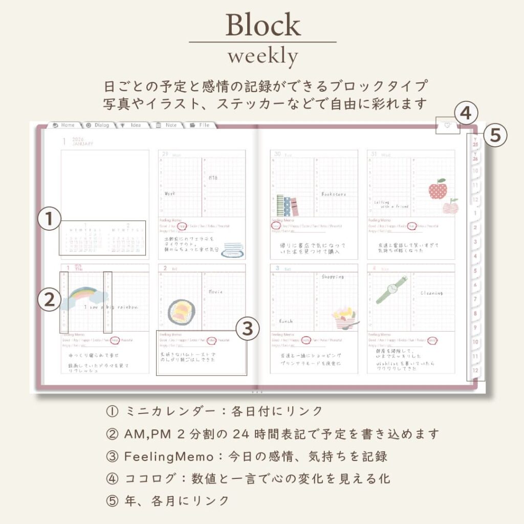 - 年・月ページは「ブロック」と「リスト」がリバーシブル