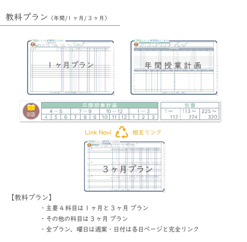 年間計画・月間計画・単元シート・授業数分の板書ページをセットで収録しています。