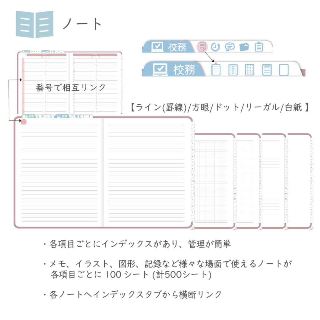用途に応じて分けて使える5種類のノートを収録。(ライン/方眼/ドット/リーガル/白紙)