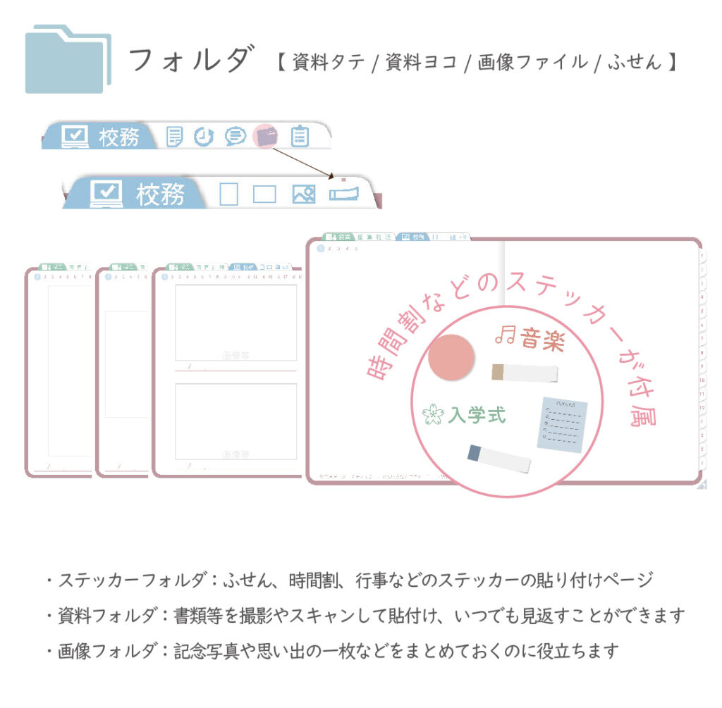 ・ステッカーフォルダ:ふせん、時間割、行事などのステッカーを貼って管理